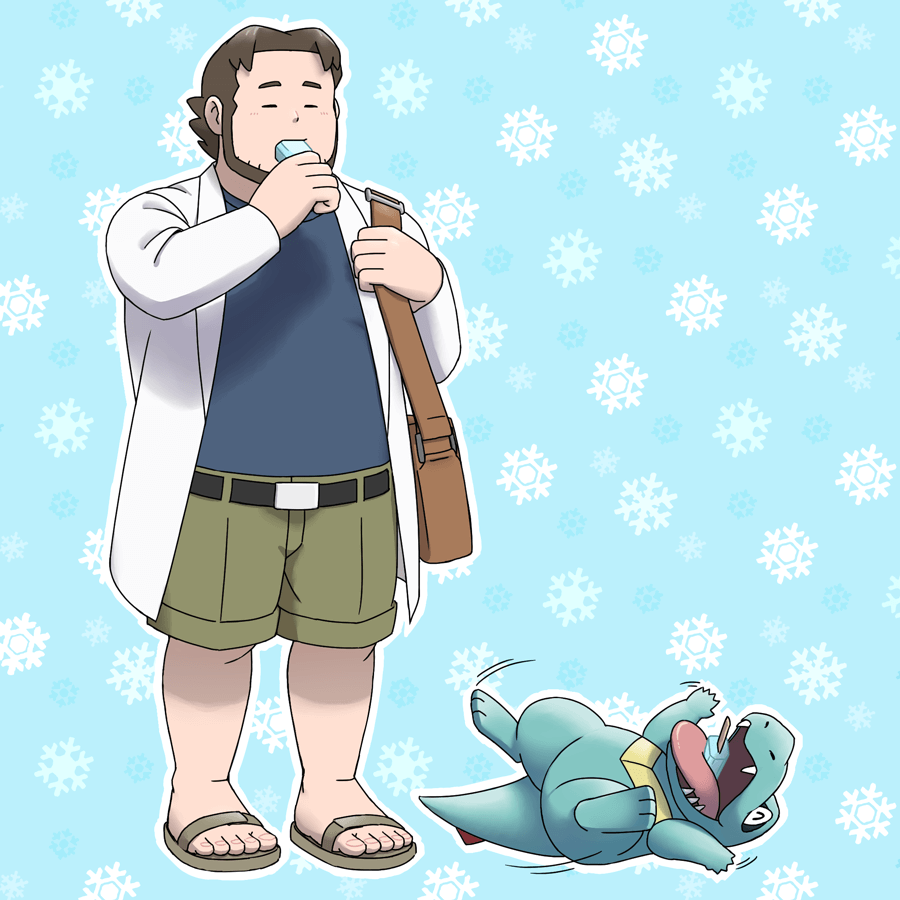 1boy beard belt belt_buckle professor_birch black_belt brown_bag brown_hair buckle closed_eyes coat commentary_request eating facial_hair food gen_2_pokemon holding holding_strap male_focus nintendo norijaga open_clothes open_coat pokemon pokemon_(creature) pokemon_ruby/sapphire/emerald popsicle sandals shirt short_hair shorts standing toes totodile white_coat