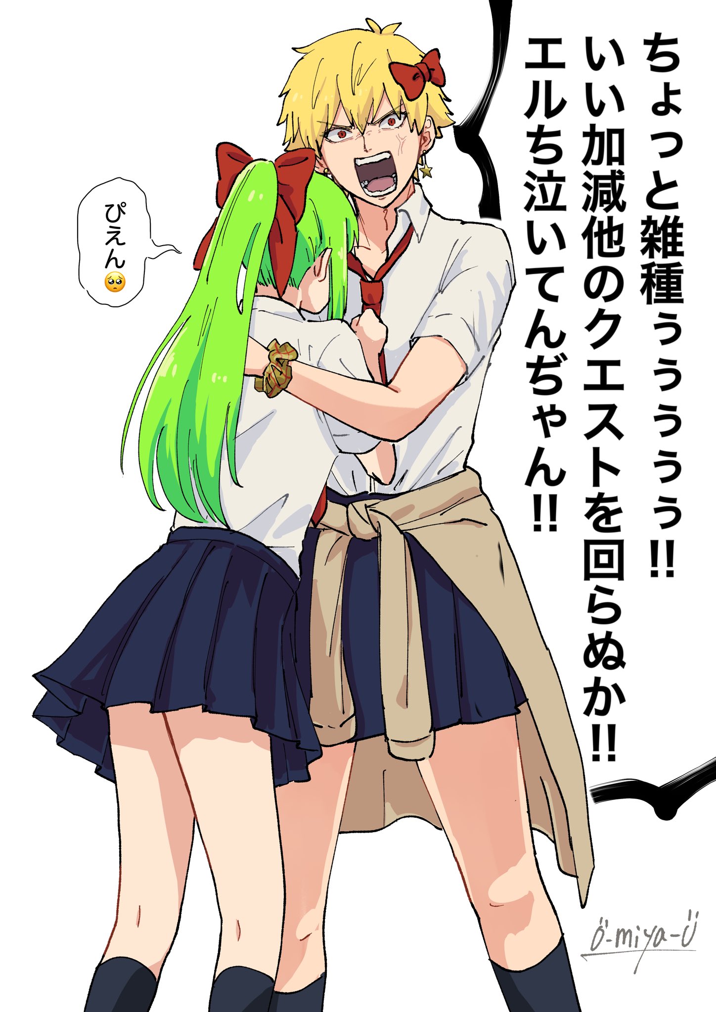 1boy 1other anger_vein blonde_hair blue_skirt bow clothes_around_waist crossdressing earrings enkidu_(fate) fate/grand_order fate_(series) gilgamesh_(fate) green_hair hair_bow highres jewelry necktie o-miya_(ohmiya_you) ponytail red_eyes school_uniform scrunchie signature skirt star_(symbol) star_earrings wrist_scrunchie
