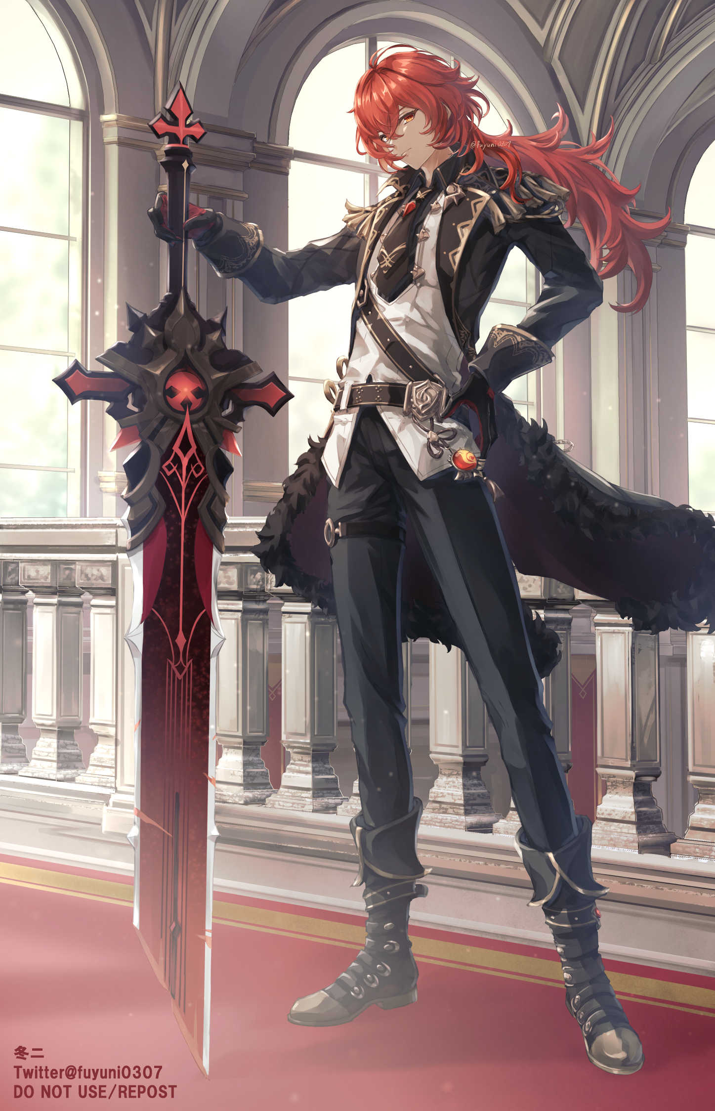 1boy artist_name belt belt_charm black_belt black_boots black_coat black_gloves black_necktie black_pants black_shirt boots charm_(object) closed_mouth coat collared_shirt commentary_request diluc_(genshin_impact) eyelashes floating_hair formal_clothes full_body fur-trimmed_coat fur_trim fuyuni0307 gem genshin_impact gloves gold_trim greatsword hair_between_eyes hand_on_own_hip hand_up head_tilt highres indoors lapels light_particles long_hair long_sleeves looking_at_viewer male_focus necktie open_clothes open_coat pants planted planted_sword planted_weapon ponytail red_eyes red_gloves red_hair shirt sidelocks solo standing sword tassel twitter_username two-tone_gloves vest vision_(genshin_impact) watermark weapon white_vest window wing_collar