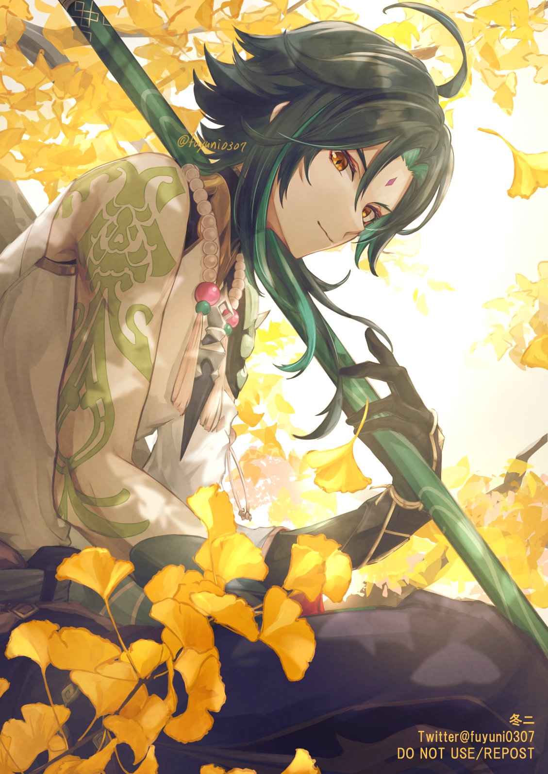 1boy ahoge arm_tattoo bare_shoulders bead_necklace beads black_gloves blue_pants branch closed_mouth commentary_request diamond-shaped_pupils diamond_(shape) eyelashes facial_mark floating_hair forehead_mark fuyuni0307 genshin_impact ginkgo_tree ginkgo_leaf gloves green_hair hand_up highres holding holding_polearm holding_weapon jewelry leaf looking_at_viewer male_focus multicolored_hair necklace pants parted_bangs polearm shirt short_hair short_hair_with_long_locks sidelocks sitting sleeveless sleeveless_shirt smile solo streaked_hair symbol-shaped_pupils tassel tattoo tree weapon white_shirt xiao_(genshin_impact) yellow_eyes