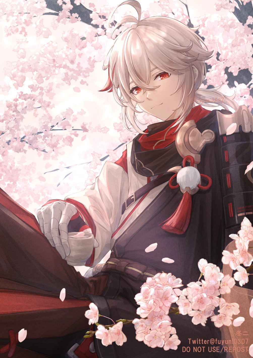 1boy antenna_hair armor artist_name bandaged_arm bandaged_hand bandages belt black_belt black_gloves black_jacket black_scarf bow branch brown_shorts cherry_blossoms chest_belt choko_(cup) closed_mouth commentary_request crossed_bangs cup eyelashes fingerless_gloves flower fuyuni0307 genshin_impact gloves hair_between_eyes hakama hakama_shorts highres holding holding_cup jacket japanese_armor japanese_clothes kaedehara_kazuha kimono looking_at_viewer low_ponytail male_focus medium_hair multicolored_hair petals pink_flower pom_pom_(clothes) ponytail red_eyes red_hair red_scarf scarf short_sleeves shorts shoulder_armor sidelocks signature sitting smile sode solo streaked_hair tassel tree twitter_username white_hair white_kimono