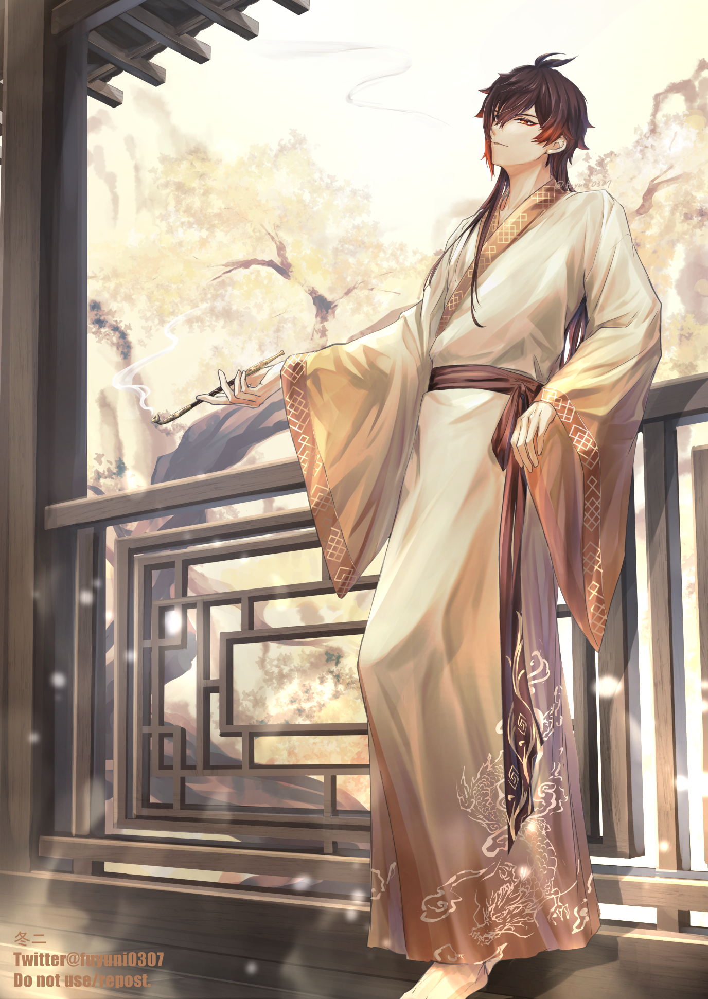 1boy alternate_costume antenna_hair architecture artist_name brown_eyes brown_hair brown_kimono brown_sash colored_tips commentary_request day dragon_print east_asian_architecture eyeshadow fence fuyuni0307 genshin_impact gradient_clothes gradient_hair hair_between_eyes hair_down highres holding holding_smoking_pipe japanese_clothes kimono lattice long_hair long_sleeves looking_at_viewer makeup male_focus multicolored_clothes multicolored_hair obi orange_hair outdoors parted_lips print_kimono red_eyeshadow sash sidelocks smoke smoking_pipe solo standing tree twitter_username watermark white_kimono wide_sleeves zhongli_(genshin_impact)
