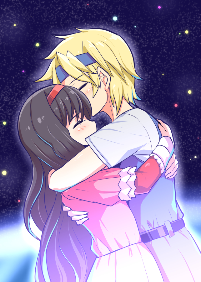 1boy 1girl belt blonde_hair brown_hair cougar_(cougar1404) dress closed_eyes gaia_gensouki hairband hug karen_(gaia_gensouki) long_hair short_sleeves space tem_(gaia_gensouki)