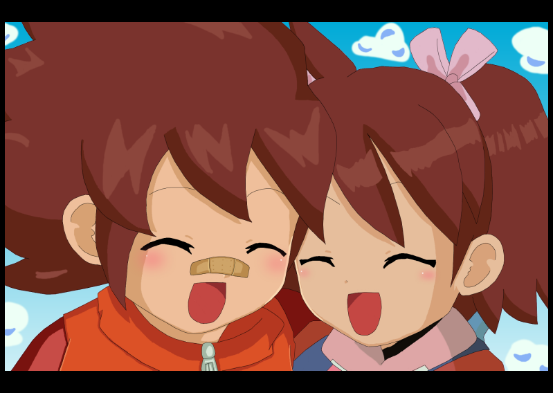 1boy 1girl bandaid bandaid_on_face brown_hair closed_eyes hair_ribbon happy hikaru_(saru_getchu) jacket laughing open_mouth red_hair ribbon saru_getchu sayaka_(saru_getchu) smile twintails