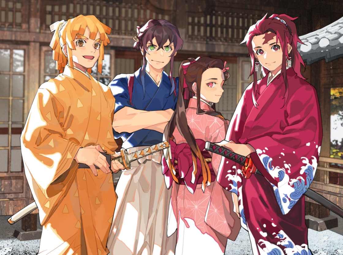 1girl 3boys agatsuma_zenitsu architecture back_bow black_hair blonde_hair blue_shirt bow brown_eyes brown_hair burn_scar cowboy_shot crossed_arms crossed_bangs d-wuti earrings east_asian_architecture gradient_hair green_eyes hair_between_eyes hair_ribbon hakama hashibira_inosuke holding holding_sword holding_weapon japanese_clothes jewelry kamado_nezuko kamado_tanjirou katana kimetsu_no_yaiba kimono long_hair looking_at_viewer looking_back multicolored_hair multiple_boys obi open_mouth orange_hair parted_bangs patterned_clothing pink_eyes pink_kimono pink_ribbon ponytail red_eyes red_hair red_kimono ribbon sash scar scar_on_face scar_on_forehead shirt short_hair_with_long_locks smile sword triangle_print wave_print weapon white_hakama wide_sleeves yellow_kimono