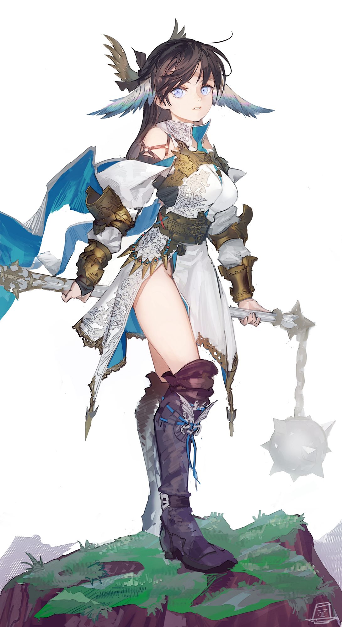 armor bare_shoulders beads blue_eyes boots brown_hair brown_headband chain diamond-shaped_pupils diamond_(shape) feather_hair_ornament feathers flail floral_print gigapuri grass grey_background hair_ornament headband highres holding holding_flail holding_weapon long_hair o-ring original parted_lips rock signature simple_background solo spikes symbol-shaped_pupils teeth vambraces weapon