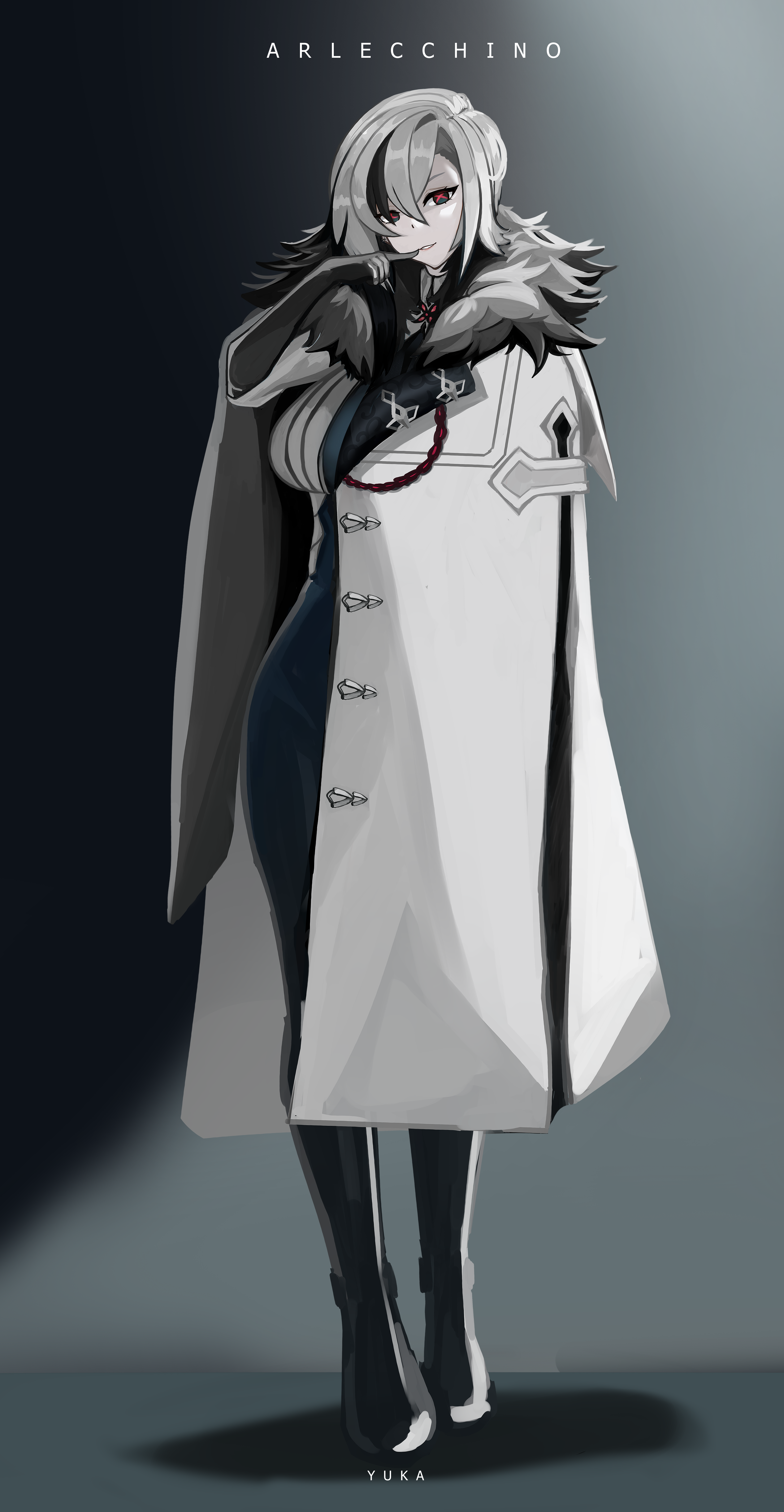 1girl absurdres arlecchino_(genshin_impact) black_gloves black_hair boots breasts coat elbow_gloves eyebrows_hidden_by_hair fatui_coat genshin_impact gloves grey_hair hair_between_eyes highres large_breasts looking_at_viewer multicolored_hair red_eyes short_hair solo standing yuka_1503