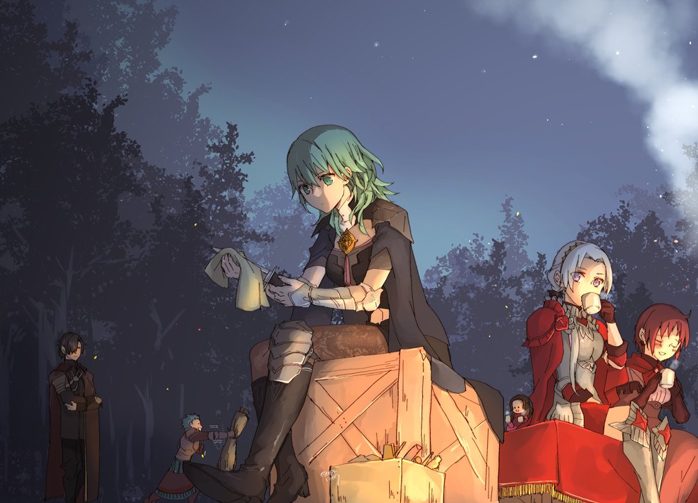 black_hair blue_eyes blue_hair breasts female_byleth_(fire_emblem) closed_mouth dorothea_arnault edelgard_von_hresvelg fire_emblem fire_emblem:_three_houses fire_emblem_warriors:_three_hopes garreg_mach_monastery_uniform gloves hair_ornament hair_over_one_eye hubert_von_vestra long_hair long_sleeves monica_von_ochs multiple_boys night nintendo open_mouth purple_eyes robaco short_hair simple_background smile white_hair yuri