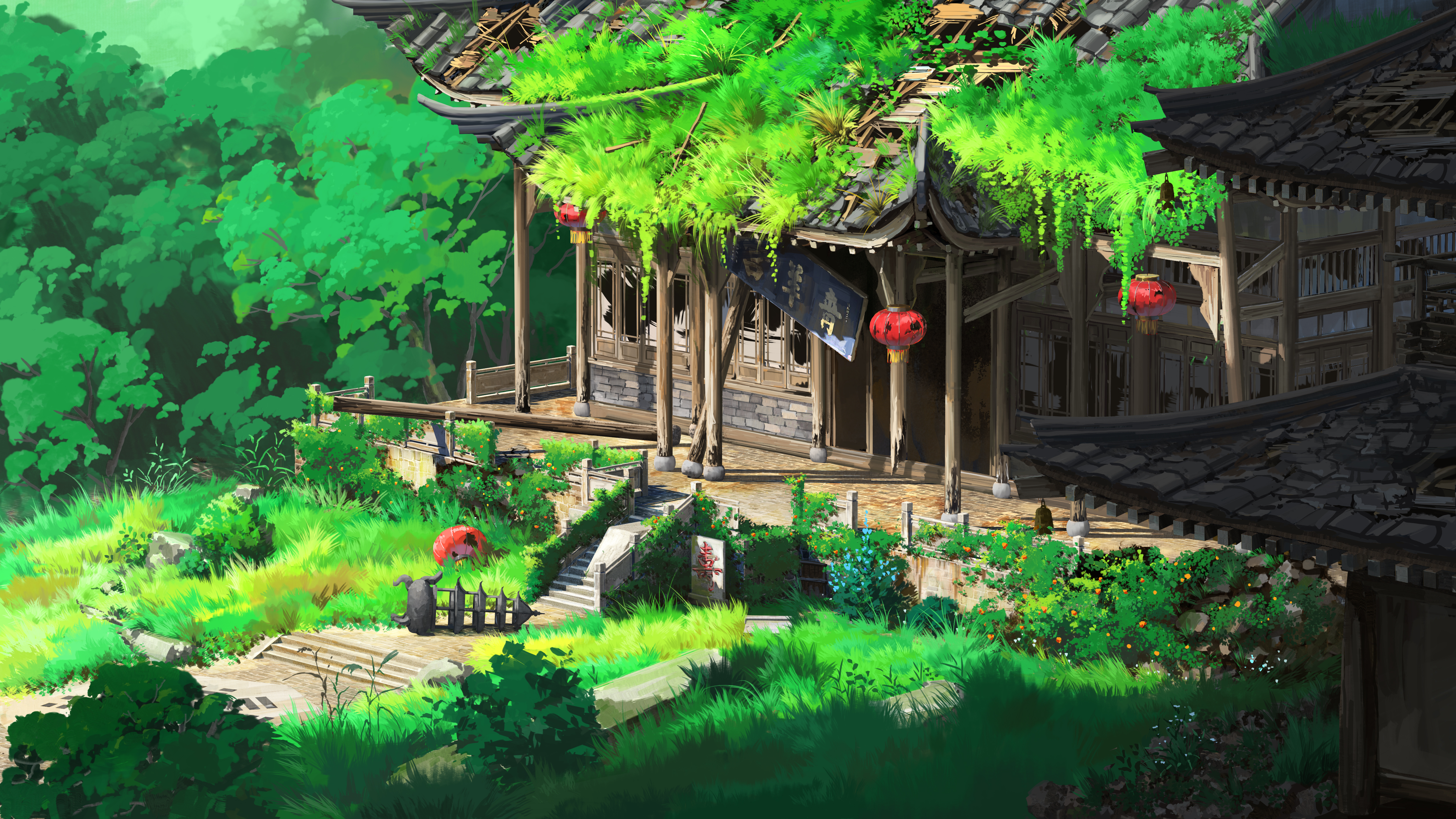 abandoned absurdres architecture broken_window bush chinese_commentary commentary_request day east_asian_architecture forest grass highres house lantern nature no_humans original outdoors overgrown paper_lantern path plant road rock scenery shade shadow sign stairs stone_walkway tree xingzhi_lv
