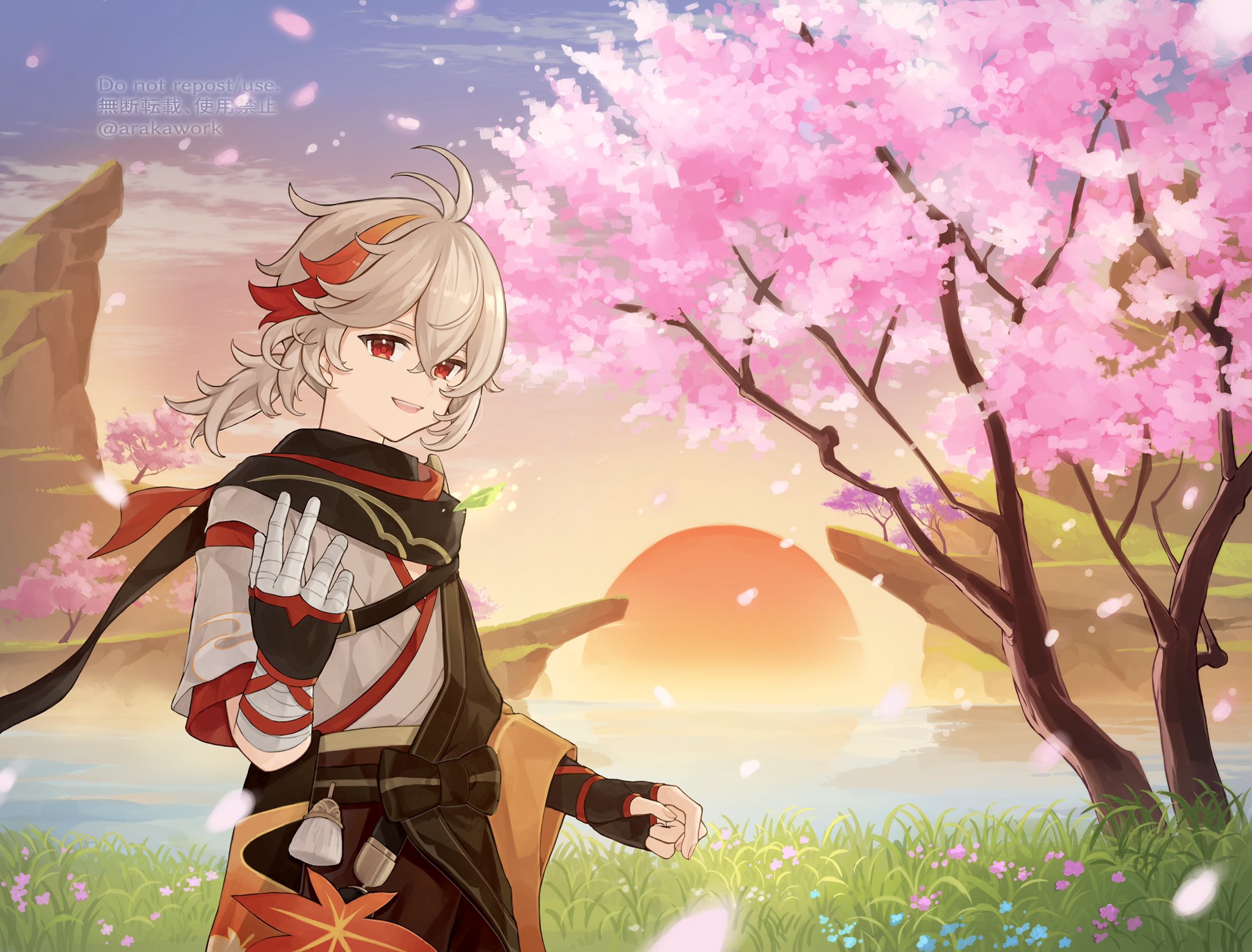 1boy antenna_hair arakawa_cristal asymmetrical_sleeves bandaged_arm bandaged_hand bandages black_gloves black_scarf bow cherry_blossoms cliff cloud commentary_request crossed_bangs evening fingerless_gloves genshin_impact gloves grass grey_hair grey_kimono hair_between_eyes hand_up highres japanese_clothes kaedehara_kazuha kimono leaf_print long_sleeves looking_at_viewer low_ponytail male_focus maple_leaf_print medium_hair mountain multicolored_hair open_mouth outdoors petals ponytail red_eyes red_hair red_scarf scarf short_sleeves sidelocks sky smile solo streaked_hair sun sunset tassel teeth tree upper_teeth_only water wide_sleeves