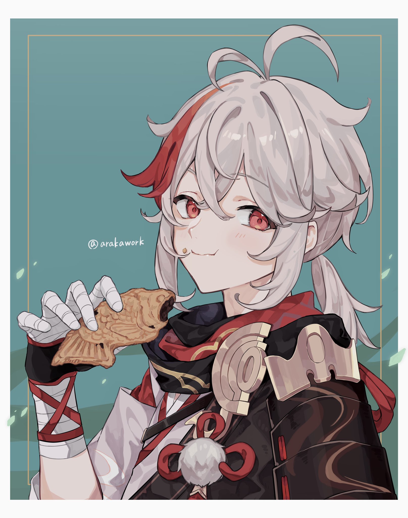 1boy antenna_hair arakawa_cristal armor artist_name bandaged_arm bandaged_hand bandages black_gloves black_scarf blue_background blush border closed_mouth commentary_request crossed_bangs eating fingerless_gloves food food_on_face genshin_impact gloves grey_hair hair_between_eyes hand_up highres holding holding_food japanese_armor japanese_clothes kaedehara_kazuha kimono looking_at_viewer low_ponytail male_focus medium_hair multicolored_hair pom_pom_(clothes) ponytail red_eyes red_hair red_scarf scarf short_sleeves shoulder_armor sidelocks sode solo streaked_hair taiyaki tassel twitter_username upper_body wagashi white_border white_kimono