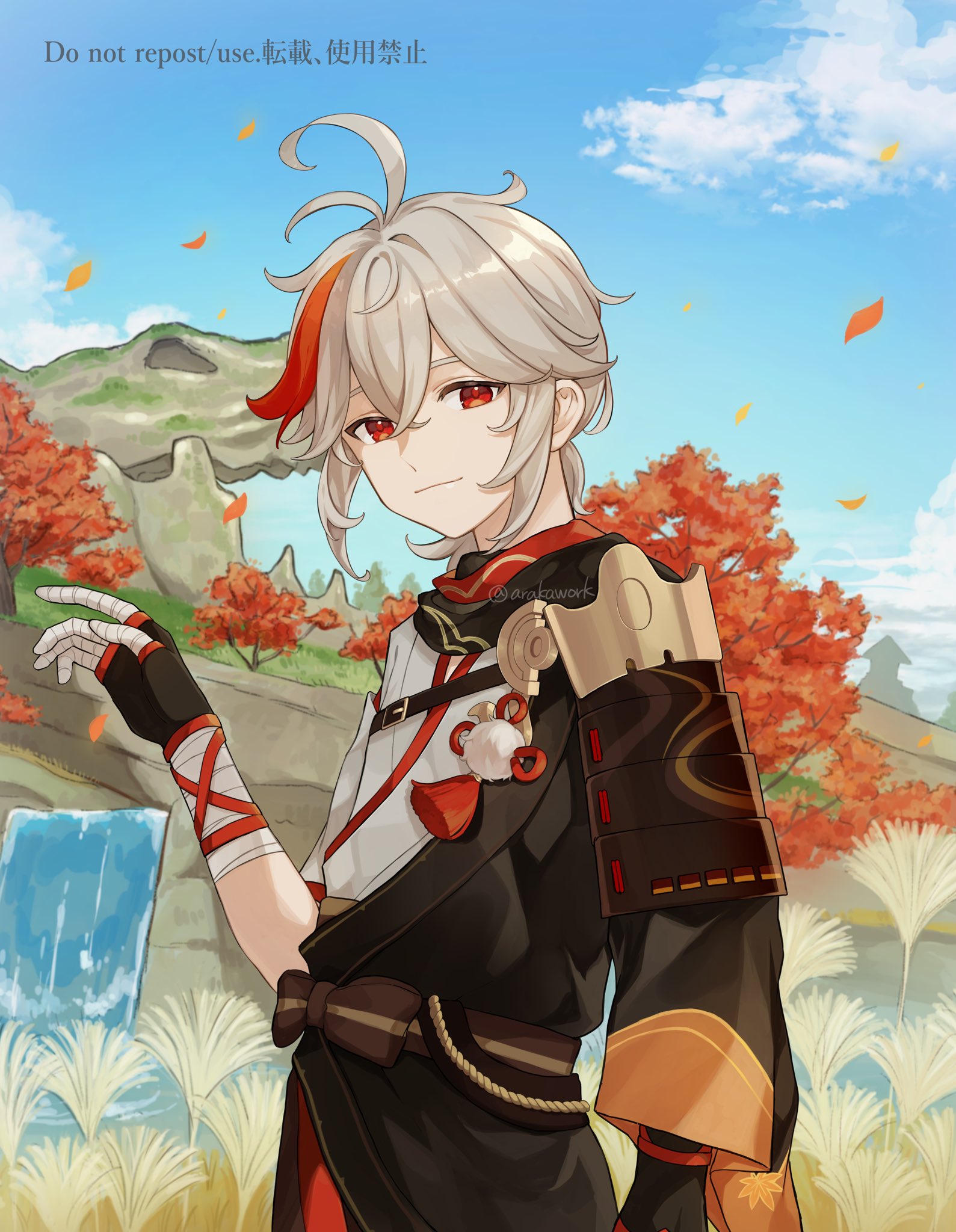 1boy antenna_hair arakawa_cristal arm_at_side armor artist_name asymmetrical_sleeves bandaged_arm bandaged_hand bandages belt belt_buckle black_belt black_gloves black_jacket black_scarf blue_sky bow brown_bow buckle chest_belt closed_mouth cloud commentary crossed_bangs day falling_leaves fingerless_gloves floating_hair genshin_impact gloves grass grey_hair hair_between_eyes hand_up highres jacket japanese_armor japanese_clothes kaedehara_kazuha kimono leaf leaf_print long_sleeves looking_at_viewer low_ponytail male_focus maple_leaf_print medium_hair multicolored_hair outdoors pom_pom_(clothes) ponytail red_eyes red_hair scarf short_sleeves shoulder_armor sidelocks skull sky smile sode solo standing streaked_hair tassel tree twitter_username water waterfall watermark white_kimono