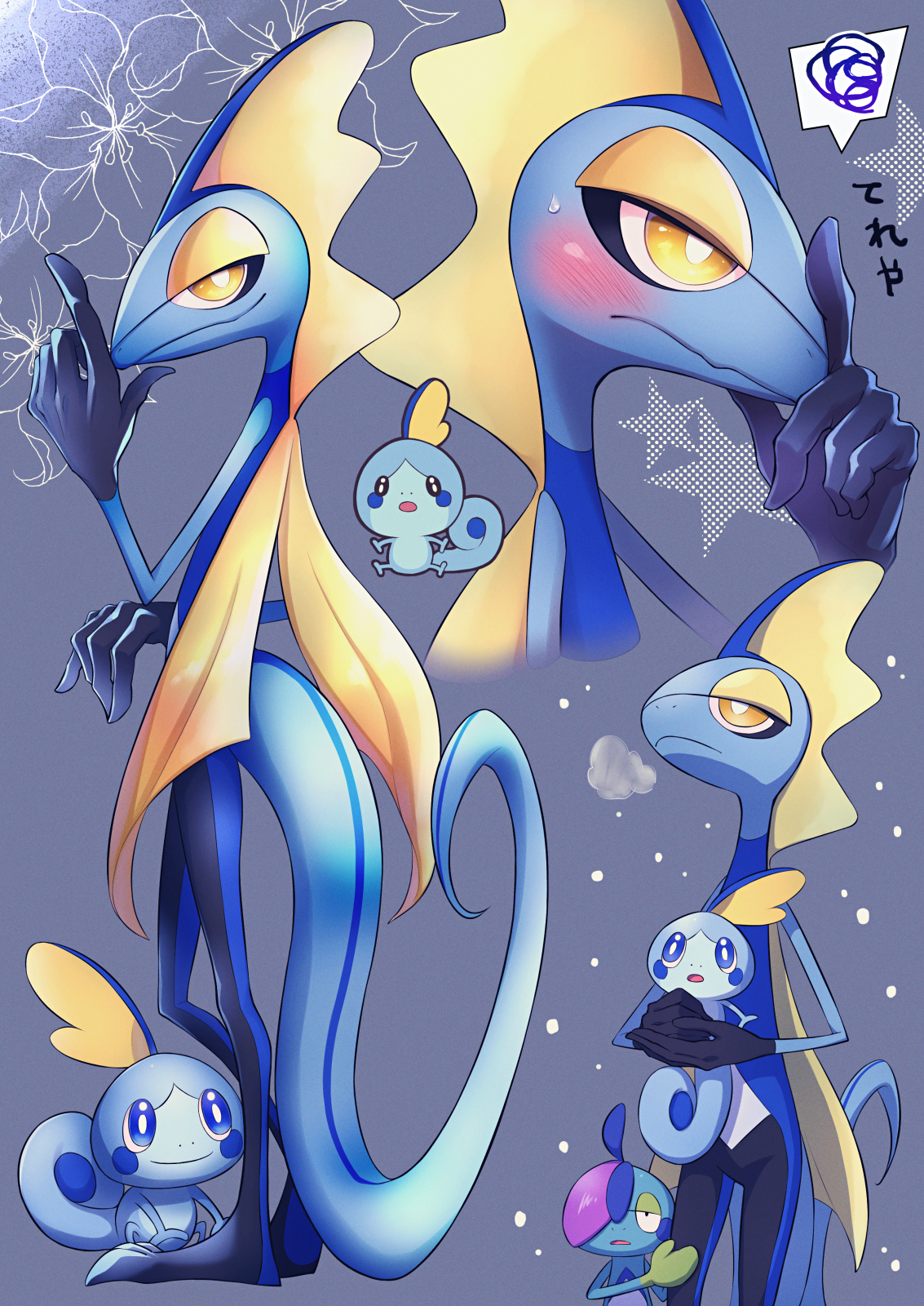 1other ahoge animal_feet black_eyes blue_eyes blue_hair blue_skin blush blush_stickers breath bright_pupils chibi chibi_inset closed_mouth colored_skin cropped_torso drizzile embarrassed family fins from_side full_body furry gen_8_pokemon grey_background half-closed_eyes hand_on_another's_thigh hand_on_own_face hand_up happy head_fins heel_up highres holding holding_pokemon index_finger_raised inteleon japanese_text lizard_tail looking_at_viewer looking_up maki_(letusgomaki) multicolored_hair multicolored_skin multiple_views nintendo open_mouth other_focus own_hands_together pokemon pokemon_(creature) profile purple_hair short_hair smile snowing sobble speech_bubble spoken_squiggle squiggle standing star_(symbol) sweat tail translation_request two-tone_hair upper_body wavy_mouth white_pupils white_skin yellow_eyes