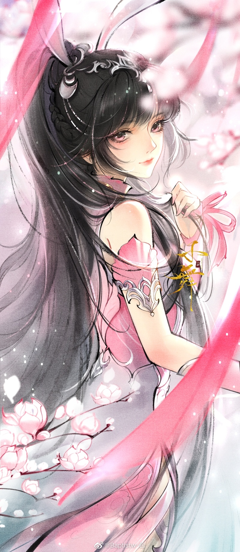 1girl animal_ears baptistw_bao black_hair branch cherry_blossoms closed_mouth douluo_dalu dress falling_petals from_side hair_ornament highres light_particles long_hair looking_at_viewer petals pink_dress ponytail rabbit_ears solo streamers upper_body xiao_wu_(douluo_dalu)