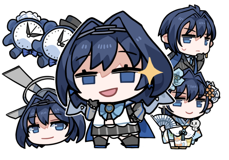 1girl blue_eyes blue_hair bow chibi clipe dress_shirt ear_piercing flower folding_fan formal_clothes hair_flower hair_intakes hair_ornament hairband hand_fan heart hololive hololive_english japanese_clothes kimono kronie_(ouro_kronii) mafia_(vocaloid) medium_hair necktie open_mouth ouro_kronii ouro_kronii_(new_year) piercing shirt short_hair skirt smile solo suit virtual_youtuber vocaloid yukkronii_(ouro_kronii)