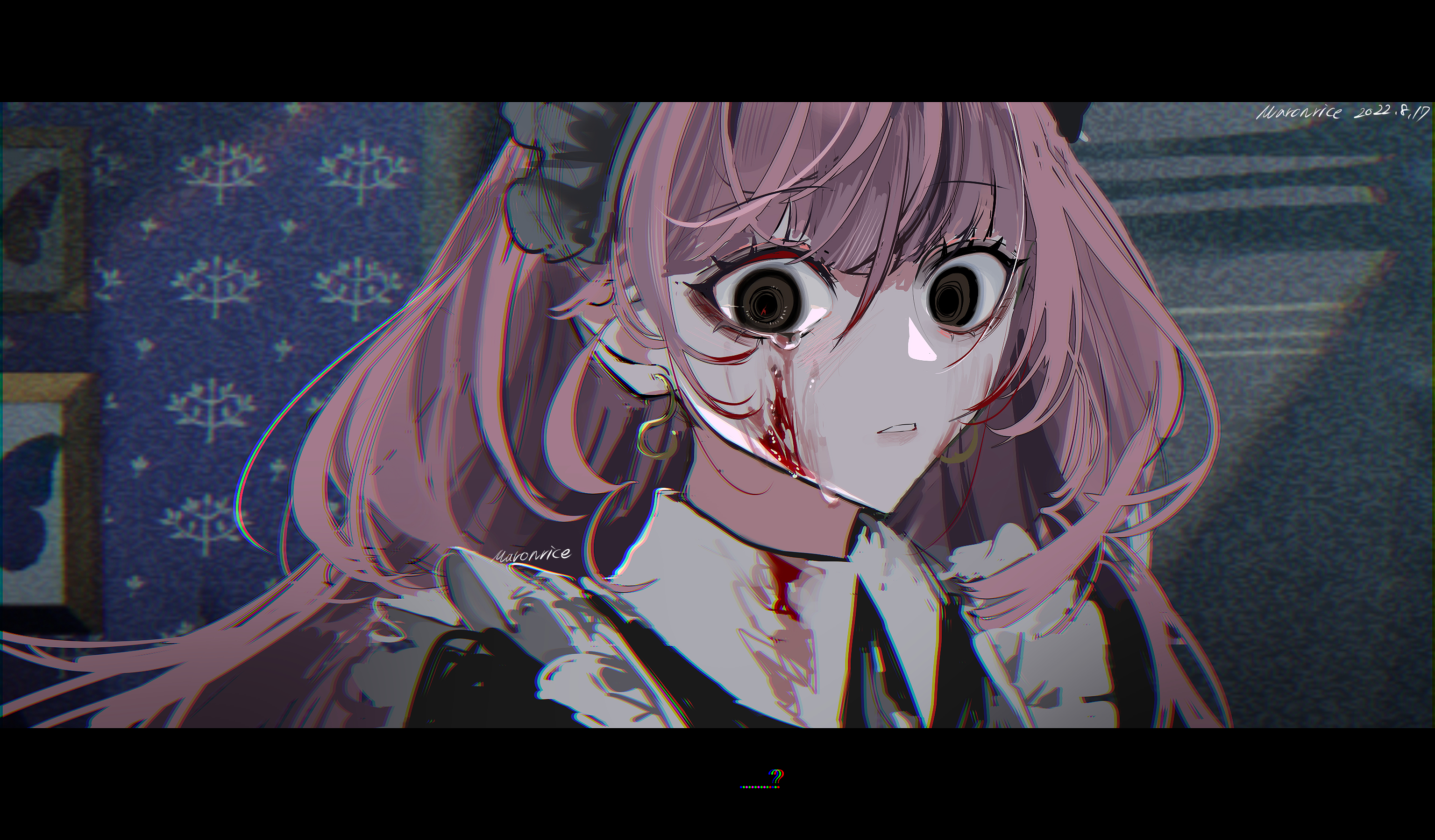 1girl artist_name black_eyes black_headwear blood blood_in_hair blood_on_clothes blood_on_face blue_background blue_butterfly bug butterfly character_request cinematic commentary_request copyright_request crying crying_with_eyes_open dated earrings eyelashes facing_viewer film_grain framed_insect grey_background hair_between_eyes highres horror_(theme) indoors insect jewelry letterboxed long_hair looking_down maid maid_headdress maronrice parted_lips pink_hair signature solo tears teeth two-tone_background upper_body wall