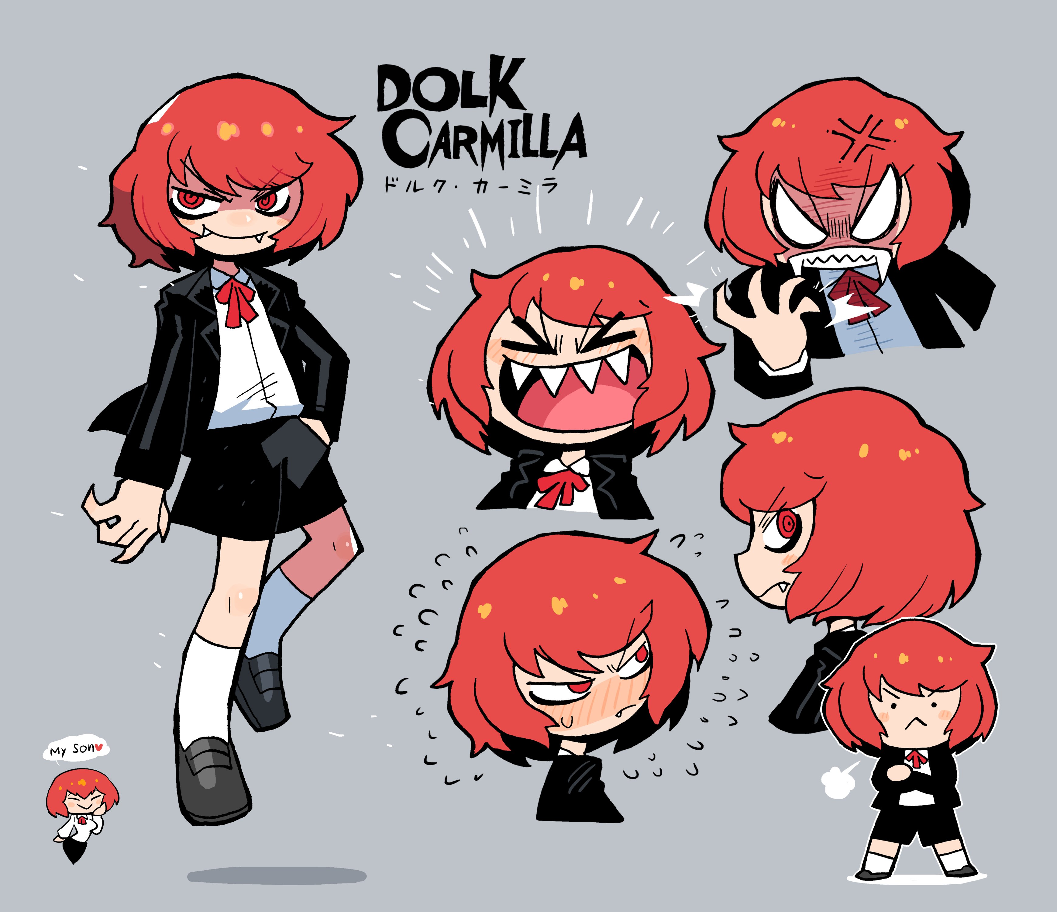 >:( >_< 1boy 1girl :< absurdres anger_vein black_dress black_jacket black_shorts blush_stickers carla_carmilla_(rariatto) character_name chibi crossed_arms dolk_carmilla dress english_text fangs fingernails floating full_body grey_background grey_footwear highres jacket long_fingernails mother_and_child mother_and_son original parent_and_child rariatto_(ganguri) red_eyes sharp_teeth shirt shoes shorts smug socks solo_focus speech_bubble teeth v-shaped_eyebrows vampire white_shirt