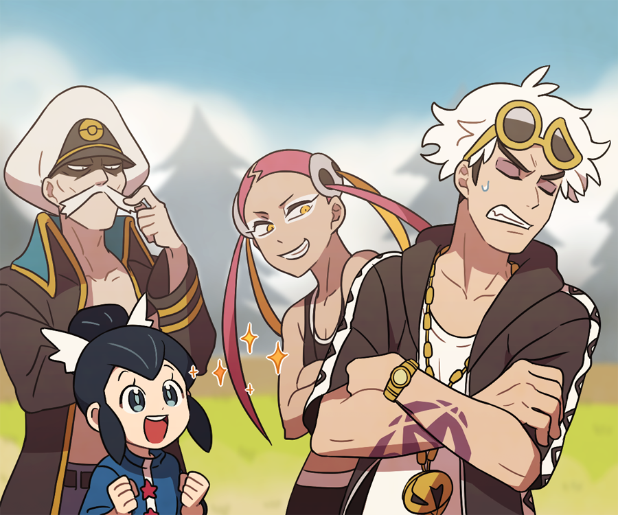 2boys 2girls :d black_eyes blonde_hair clenched_teeth closed_eyes coat commentary crossed_arms day drake_(pokemon) eyeshadow eyewear_on_head facial_hair grin guzma_(pokemon) hair_ornament hat hood hooded_jacket jacket liza_(pokemon) long_hair makeup multicolored_hair multiple_boys multiple_girls mustache nintendo no_shirt open_clothes open_coat open_mouth outdoors peaked_cap pink_hair plumeria_(pokemon) pokemon pokemon_masters_ex pokemon_omega_ruby_and_alpha_sapphire pokemon_sun_and_moon quad_tails shirt short_hair short_sleeves skull_hair_ornament sky smile ssalbulre sunglasses tank_top team_skull teeth trench_coat two-tone_hair upper_teeth_only white_hair white_headwear white_shirt yellow-framed_eyewear yellow_eyes