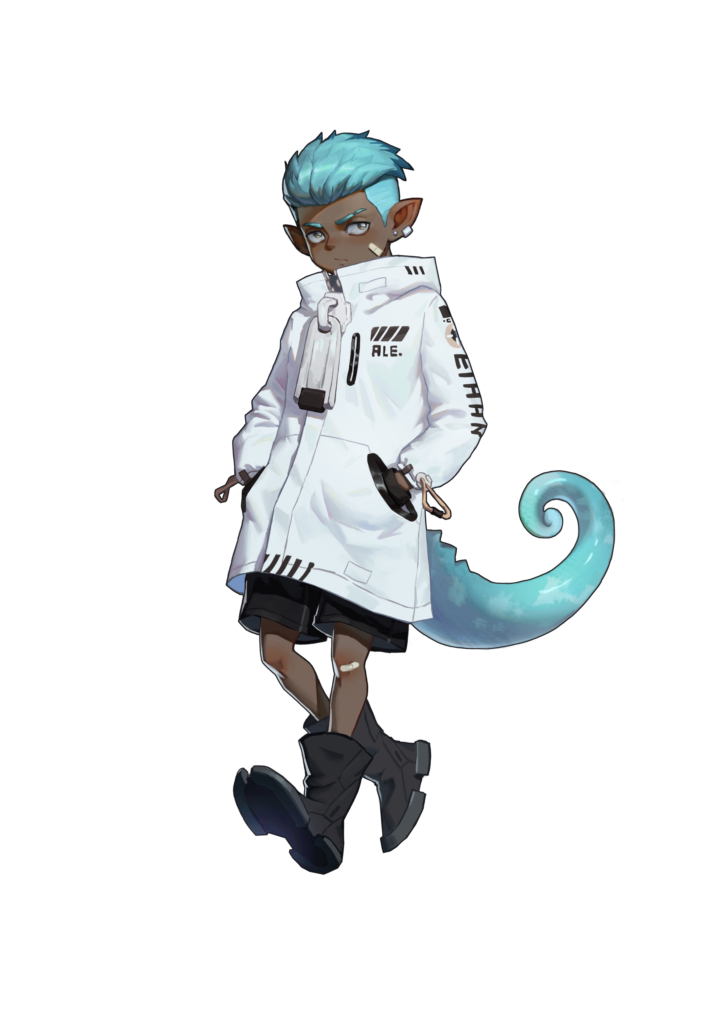 1boy absurdres ale55 aqua_hair arknights black_footwear blue_hair chameleon_tail dark-skinned_male dark_skin earrings ethan_(arknights) full_body gloves goggles goggles_on_head hand_in_pocket highres hood jacket jewelry looking_at_viewer male_focus pointy_ears simple_background solo tail white_background
