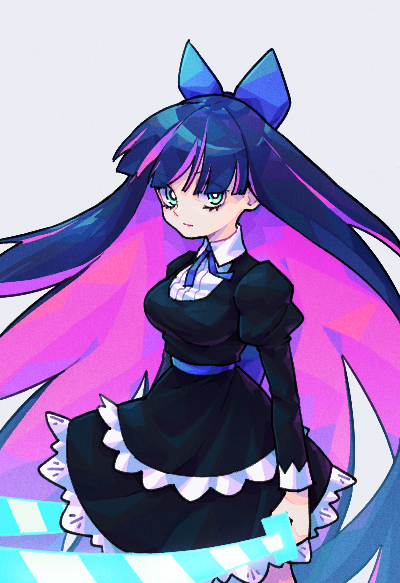 1girl 28_(282teeth) aqua_eyes black_dress blue_bow blue_hair blue_ribbon bow bright_pupils closed_mouth dark_blue_hair dress dual_wielding eyelashes eyes_visible_through_hair film_grain grey_background hair_bow highres holding holding_sword holding_weapon katana looking_at_viewer multicolored_hair panty_&_stocking_with_garterbelt pink_lips puffy_sleeves purple_hair ribbon simple_background solo stocking_(psg) streaked_hair sword two-tone_hair weapon white_pupils