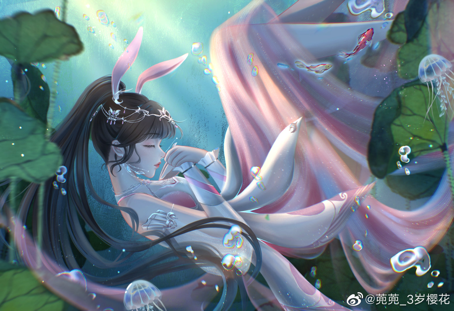 1girl animal_ears brown_hair bubble closed_mouth doudou_3_sui_yinghua douluo_dalu dress earrings closed_eyes fish from_side jellyfish jewelry light lily_pad long_hair pink_dress ponytail rabbit_ears sinking solo underwater xiao_wu_(douluo_dalu)