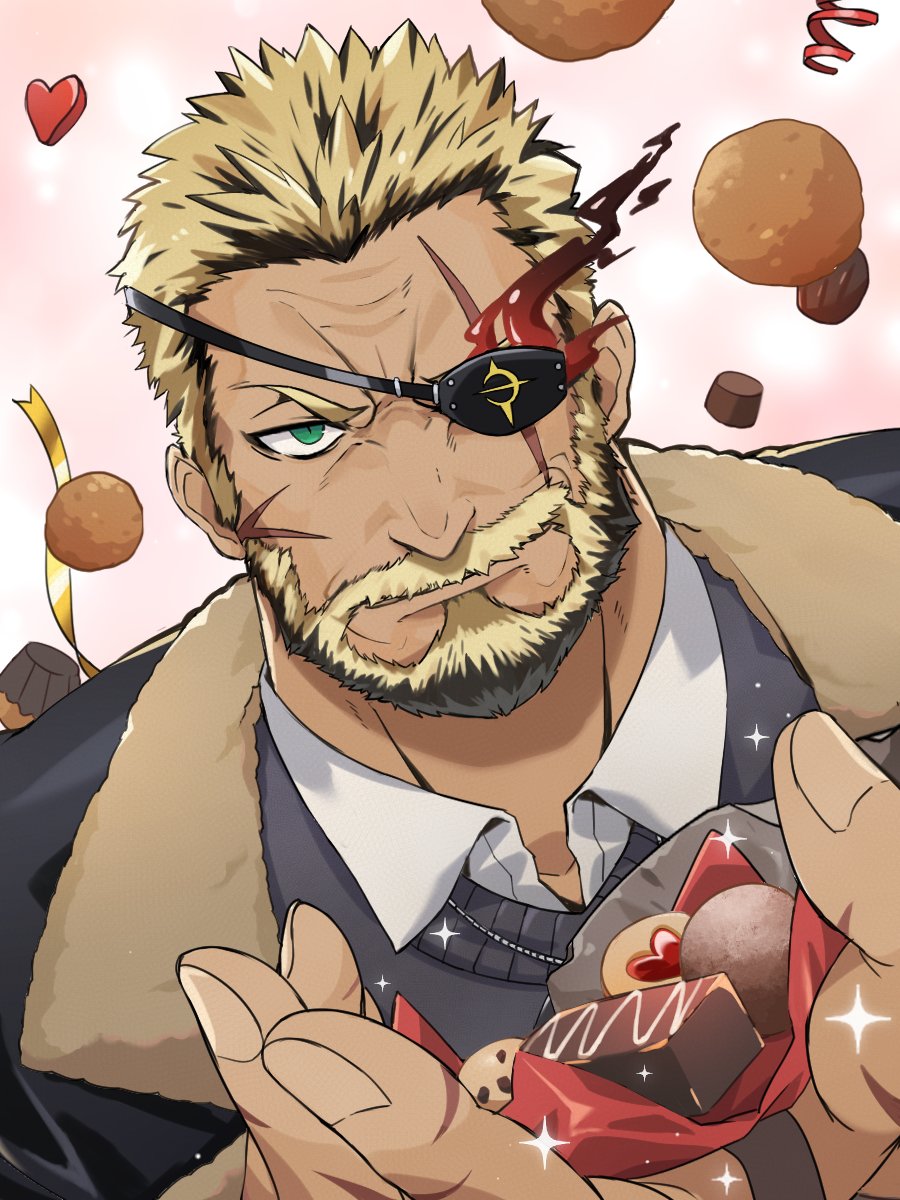 1boy balor_(housamo) bara beard black_hair blonde_hair chocolate collared_shirt commentary_request eyepatch facial_hair flaming_eye green_eyes grey_sweater heart highres looking_at_viewer male_focus mature_male multicolored_hair muscular muscular_male nizitaro outstretched_hand pink_background scar scar_across_eye scar_on_face scar_on_hand shirt short_hair solo sweater tokyo_houkago_summoners two-tone_hair upper_body valentine white_shirt