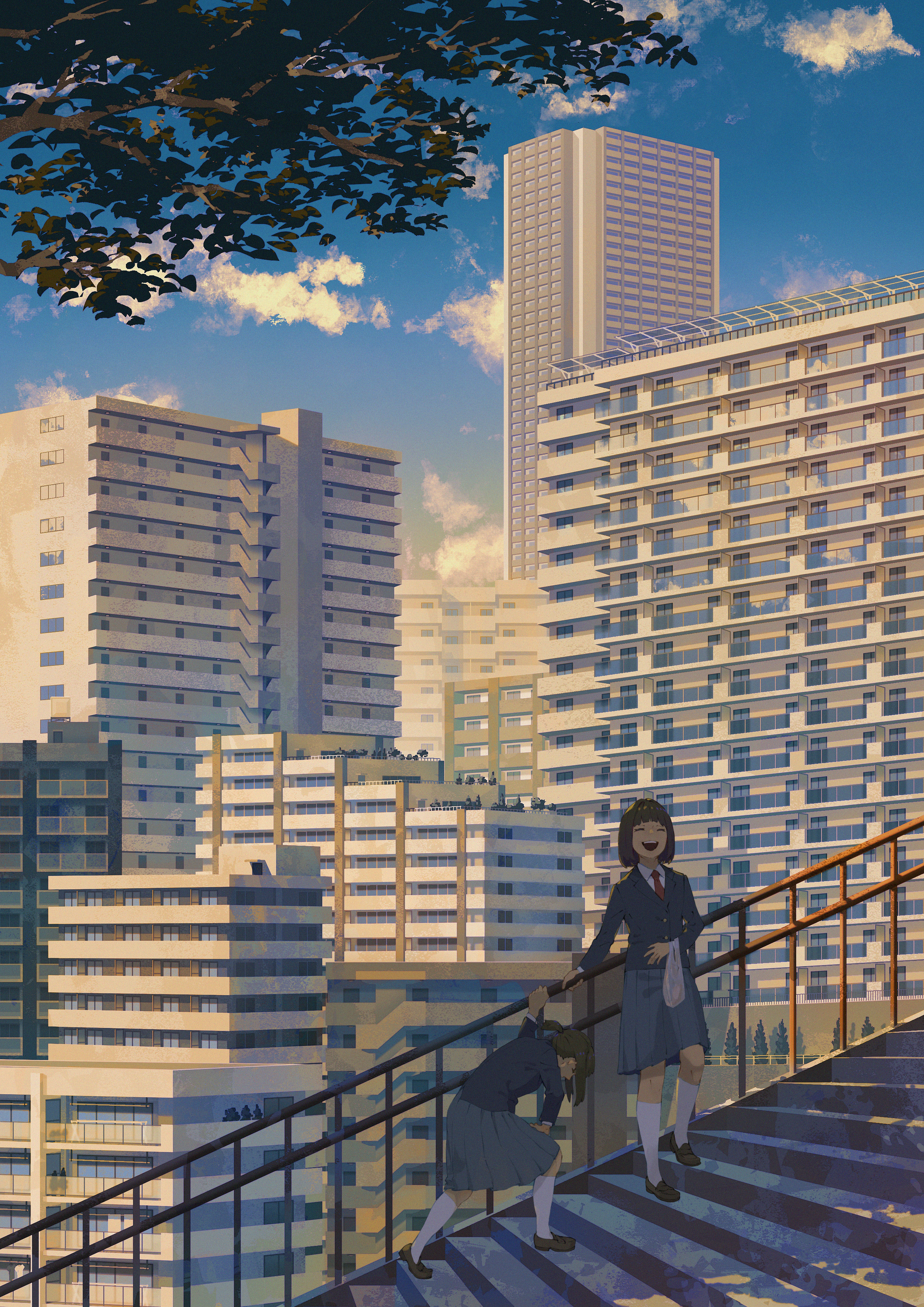 2girls absurdres bag blazer blue_jacket blue_skirt blue_sky building cloud day exhausted closed_eyes highres holding holding_bag jacket kneehighs laughing loafers long_sleeves multiple_girls necktie open_mouth original outdoors pinoj0214 plastic_bag pleated_skirt railing red_necktie scenery school_uniform shirt shoes short_hair skirt sky skyscraper socks stairs white_shirt white_socks wide_shot