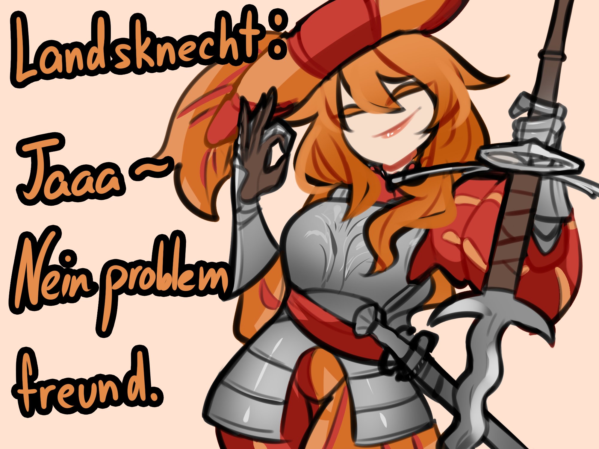 1girl armor breastplate centurii-chan closed_eyes closed_mouth colored_eyelashes commentary english_commentary english_text gauntlets german_text hat hat_feather highres holding holding_sword holding_weapon landsknecht_(centurii-chan) lips long_hair ok_sign orange_hair original pink_background sheath sheathed simple_background solo sword translated weapon wide_sleeves zweihander