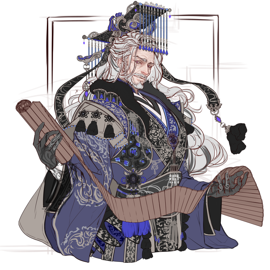 1boy beard facial_hair gloves grey_gloves headwear_request long_hair looking_at_viewer mature_male meisai military military_uniform old old_man original scroll solo tassel upper_body white_background white_hair