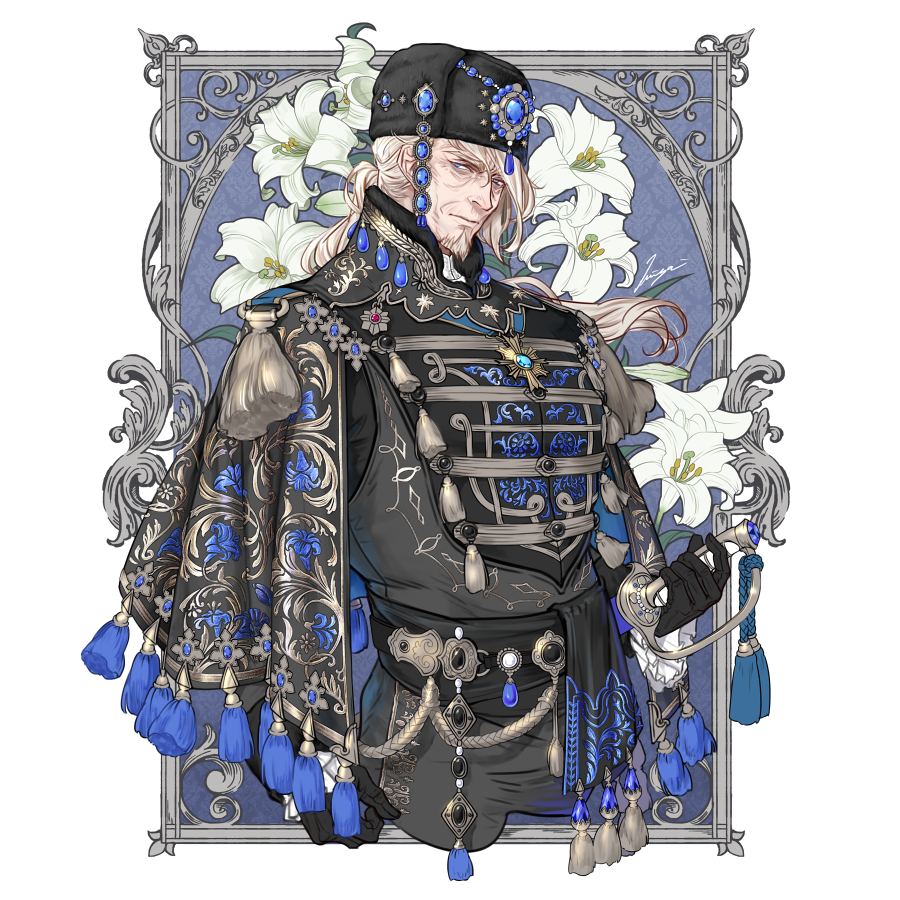1boy artist_name beard black_gloves black_headwear blue_eyes facial_hair floral_print gloves hat_ornament long_hair mature_male meisai military military_uniform old old_man original sheath sheathed solo tassel white_hair