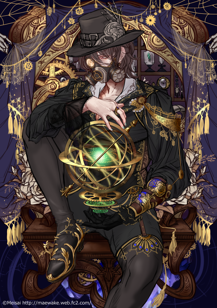 1boy artist_name black_boots black_gloves black_hat black_pants black_shirt boots brown_hair gas_mask gears gloves gold_trim hat jewelry knee_boots long_sleeves mask mature_male medium_hair meisai monocle old old_man original pants ring shirt sitting skeletal_hand solo steampunk watermark web_address