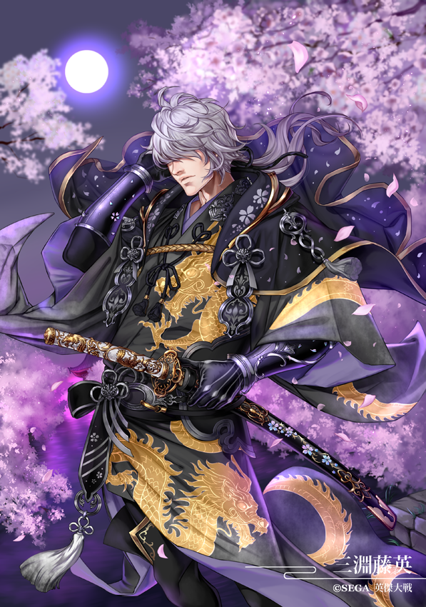 1boy black_gloves cherry_blossoms company_name dragon_print eiketsu_taisen full_moon gloves gold_trim grey_hair hair_over_eyes hand_up japanese_clothes katana long_hair male_focus meisai moon night official_art outdoors sheath standing sword tassel weapon