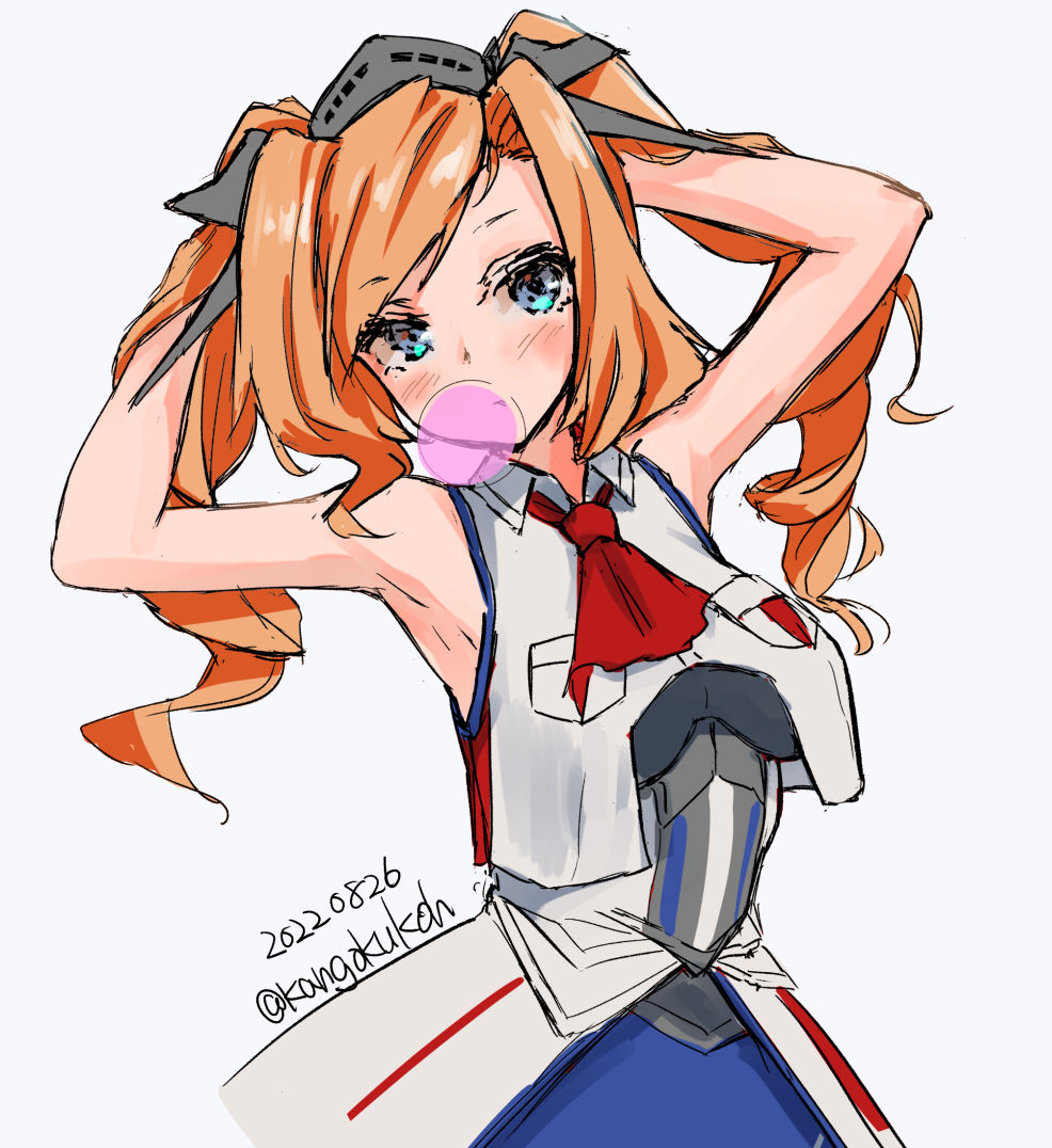 1girl arms_behind_head ascot blonde_hair blowing_bubble_gum blowing_bubbles blue_dress blue_eyes breast_pocket breasts chewing_gum cowboy_shot dress drill_hair honolulu_(kancolle) kangoku_kou kantai_collection large_breasts long_hair military military_uniform one-hour_drawing_challenge pocket red_ascot shirt sleeveless sleeveless_jacket sleeveless_shirt solo twin_drills twintails