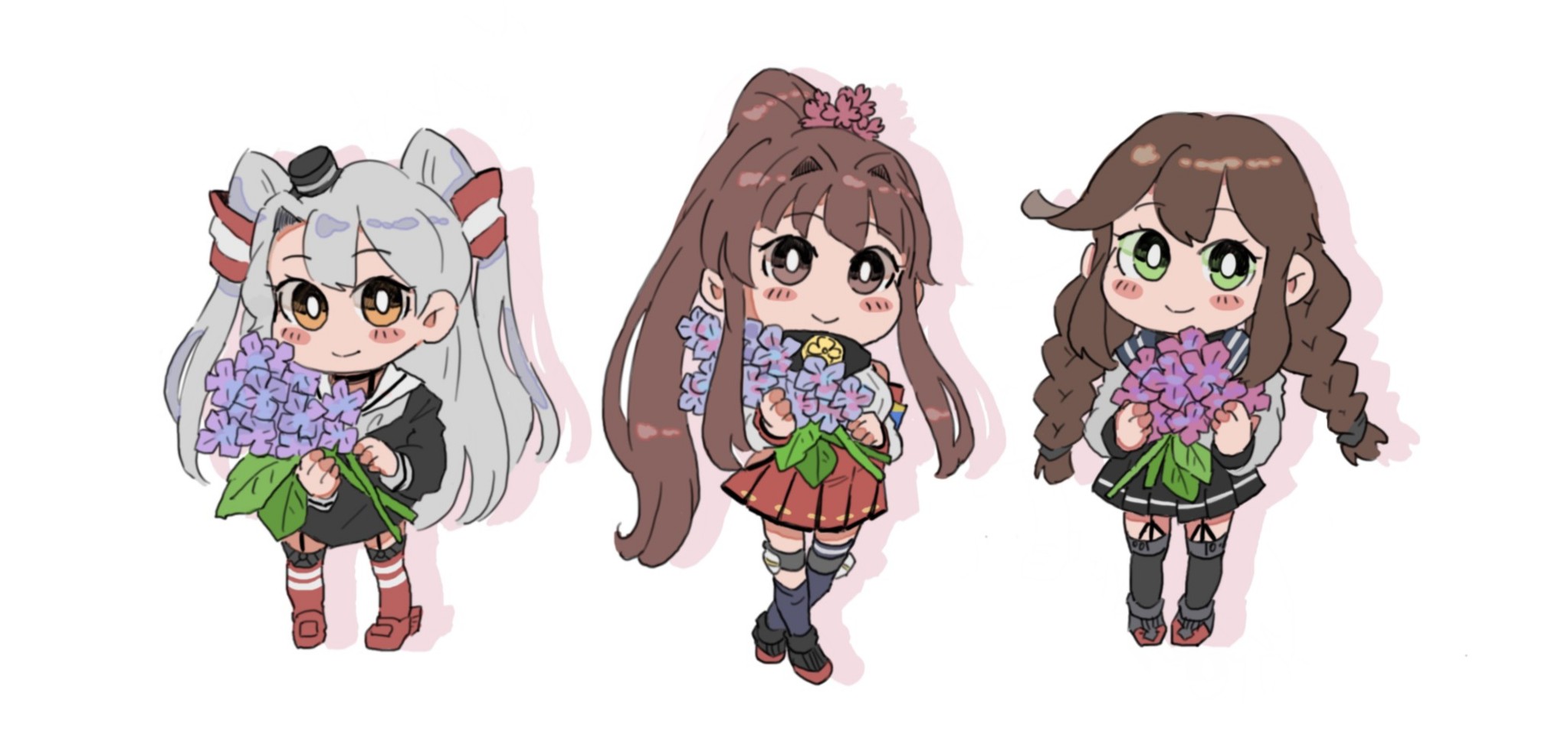3girls amatsukaze_(kancolle) bad_id bad_twitter_id black_sailor_collar black_skirt black_thighhighs bouquet braid brown_dress brown_hair cherry_blossoms collar commentary_request dress flower garter_straps green_eyes grey_hair hair_flower hair_ornament hair_tubes hat highres holding holding_bouquet kantai_collection long_hair long_sleeves metal_collar mini_hat multiple_girls noshiro_(kancolle) noshiro_kai_ni_(kancolle) pleated_skirt ponytail red_skirt red_thighhighs sailor_collar sailor_dress sailor_shirt sakuramon school_uniform serafuku shirt short_dress simple_background single_thighhigh skirt smokestack_hair_ornament swept_bangs thighhighs twin_braids two_side_up white_background white_sailor_collar yamato_(kancolle) yumebota