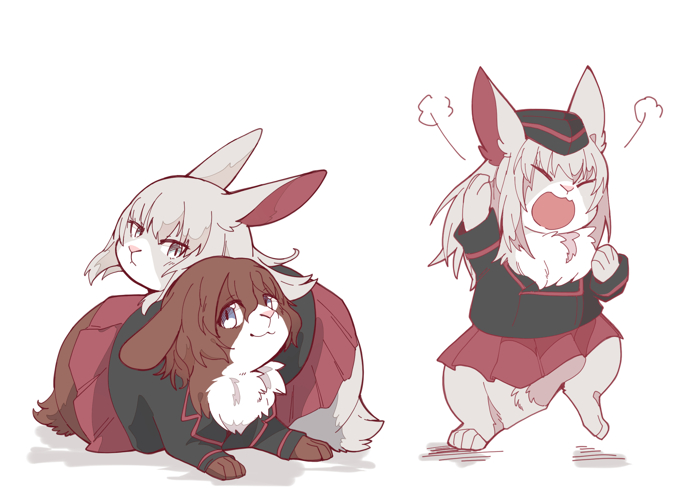 akaboshi_koume angry animalization black_headwear black_jacket blue_eyes brown_hair closed_eyes closed_mouth commentary frown fume garrison_cap girls_und_panzer grey_hair hasekura_(hachinochun) hat highres itsumi_erika jacket kuromorimine_military_uniform long_sleeves looking_at_viewer lying medium_hair military military_hat military_uniform miniskirt no_humans on_stomach open_mouth pleated_skirt puff_of_air red_skirt short_hair simple_background sitting skirt smile standing wavy_hair white_background