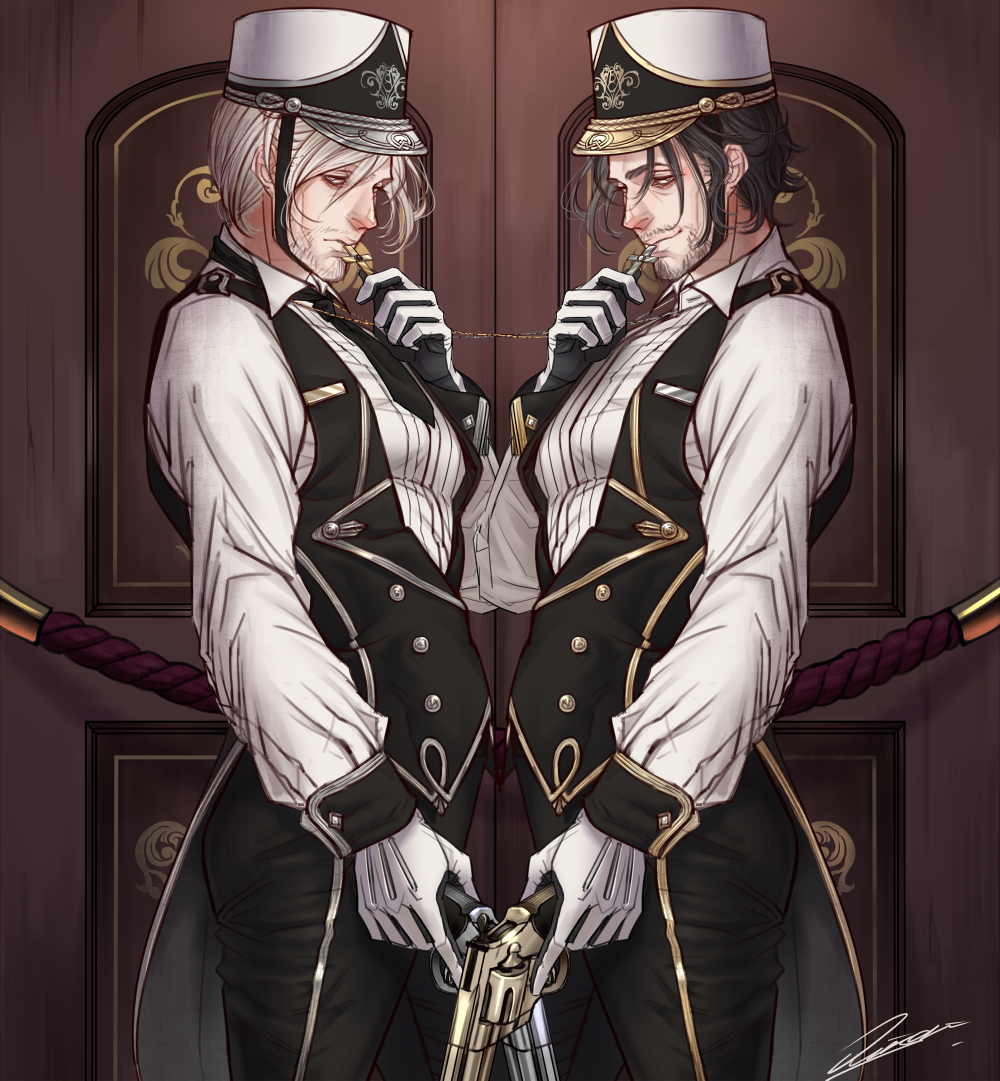 2boys black_hair black_pants door facial_hair gloves gun hand_up hat holding holding_gun holding_weapon indoors long_sleeves male_focus mature_male meisai multiple_boys old old_man original pants shirt standing stubble uniform weapon white_gloves white_hair white_headwear white_shirt