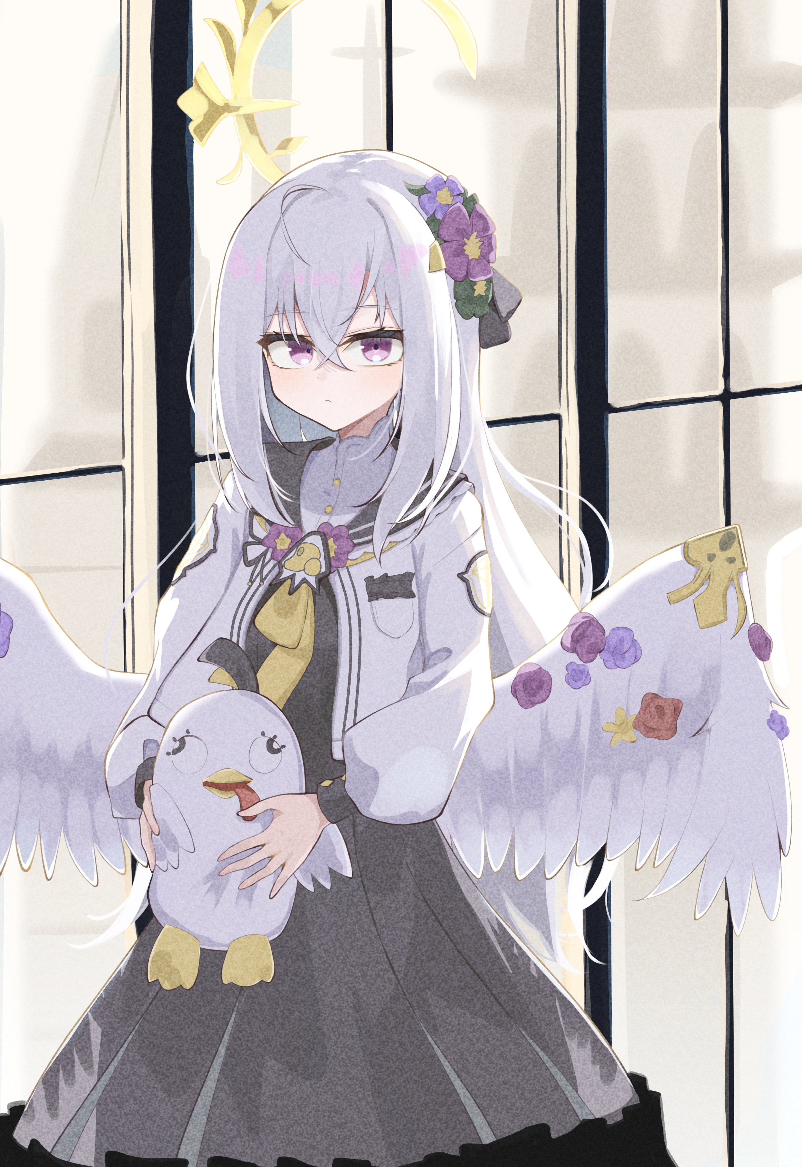1girl absurdres ahoge angel angel_wings antenna_hair azusa_(blue_archive) blue_archive closed_mouth dress flower frills grey_hair hair_flower hair_ornament highres peroro_(blue_archive) school_uniform shino2121 stuffed_animal stuffed_toy white_hair wings