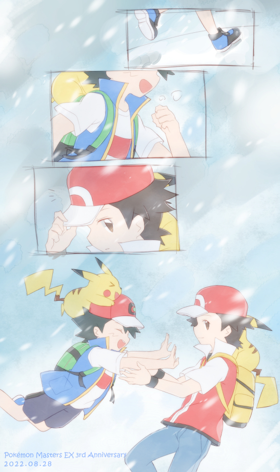>_< 2boys :d anniversary ash_ketchum backpack bag baseball_cap brown_eyes closed_eyes gen_1_pokemon green_bag hand_on_headwear hat imminent_hug jacket male_focus miu_(chuyu825) multiple_boys nintendo on_head open_mouth pikachu pokemon pokemon_(anime) pokemon_(creature) pokemon_heartgold_and_soulsilver pokemon_journeys pokemon_masters_ex pokemon_on_head red_(pokemon) red_headwear red_jacket running shirt short_hair short_sleeves shorts sleeveless sleeveless_jacket smile snowing t-shirt yellow_bag