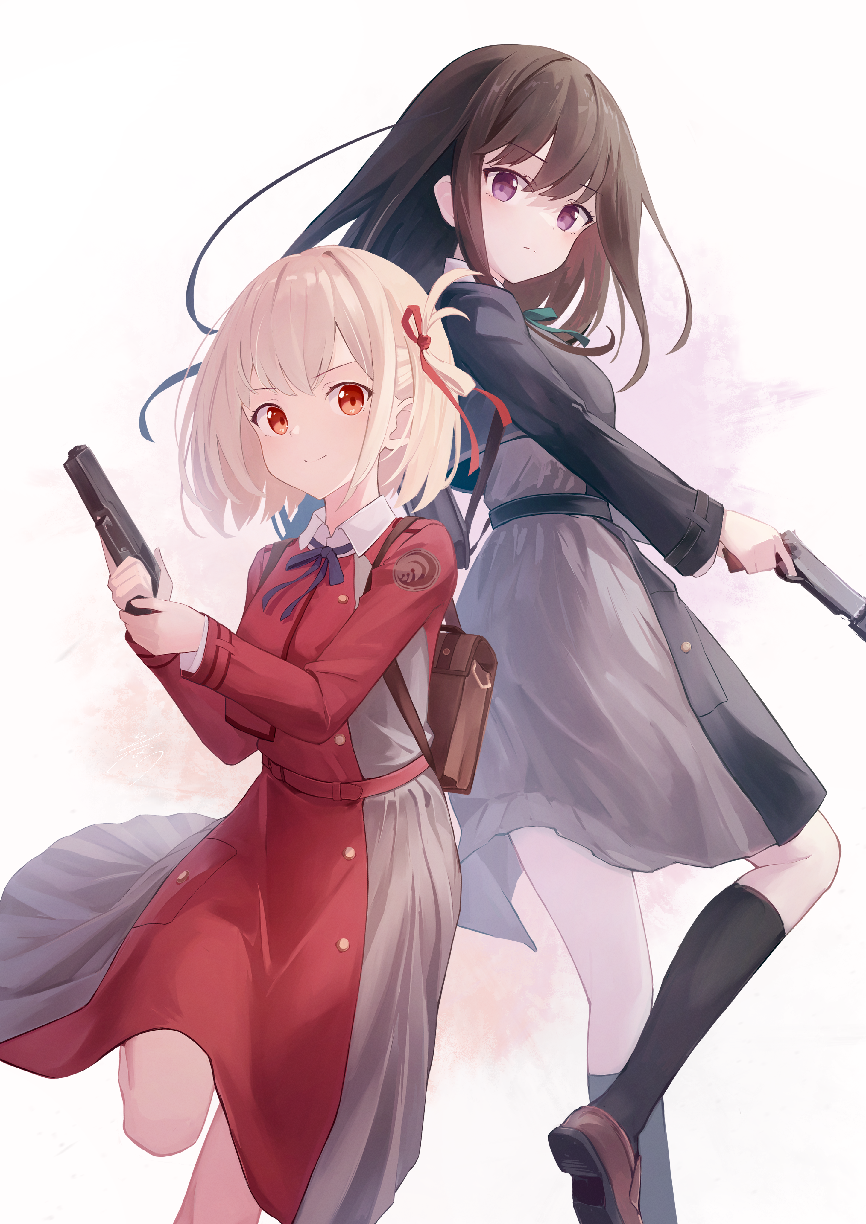 2girls absurdres back-to-back black_hair black_socks blonde_hair blue_dress breasts dress flower grey_dress gun highres holding holding_gun holding_weapon inoue_takina kneehighs leg_up long_hair looking_at_viewer lycoris_recoil lycoris_uniform medium_breasts minau37 multiple_girls nishikigi_chisato purple_eyes red_dress red_eyes red_flower red_ribbon ribbon school_uniform smile socks spider_lily two-tone_dress weapon white_background