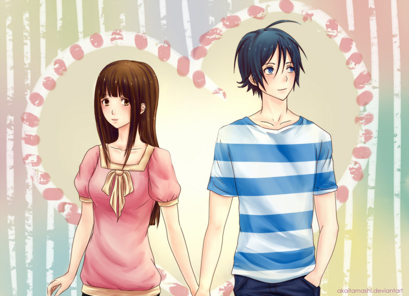1boy 1girl azuki_miho bakuman black_hair blush brown_hair couple long_hair mashiro_moritaka