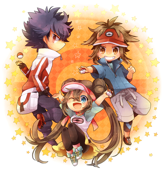 :d black_hair black_pants black_pantyhose blue_eyes blue_jacket bow brown_eyes brown_hair donut_hair_bun double_bun fanny_pack frown grey_pants hair_bun hugh_(pokemon) jacket nate_(pokemon) nintendo open_mouth pants pantyhose pantyhose_under_shorts pink_bow poke_ball poke_ball_(basic) pokemon pokemon_bw2 raglan_sleeves red_eyes rosa_(pokemon) shoes shooting428star shorts smile sneakers twintails visor_cap yellow_shorts