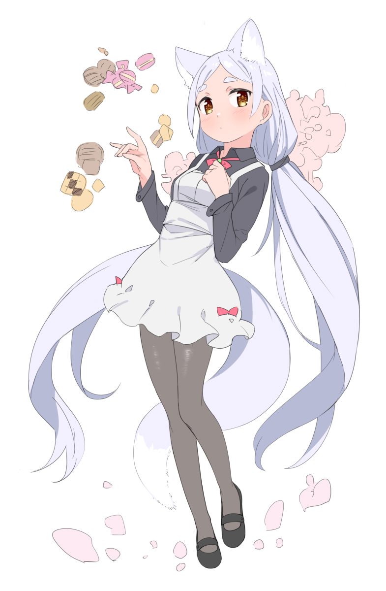 1girl animal_ear_fluff animal_ears black_pantyhose black_shirt black_shoes brown_hair closed_mouth cookie dot_mouth food fox_ears fox_girl fox_shadow_puppet fox_tail full_body highres long_hair long_sleeves looking_at_viewer low_twintails original pantyhose saiste shirt shoes simple_background solo tail thick_eyebrows twintails unfinished very_long_hair white_background white_hair wing_collar