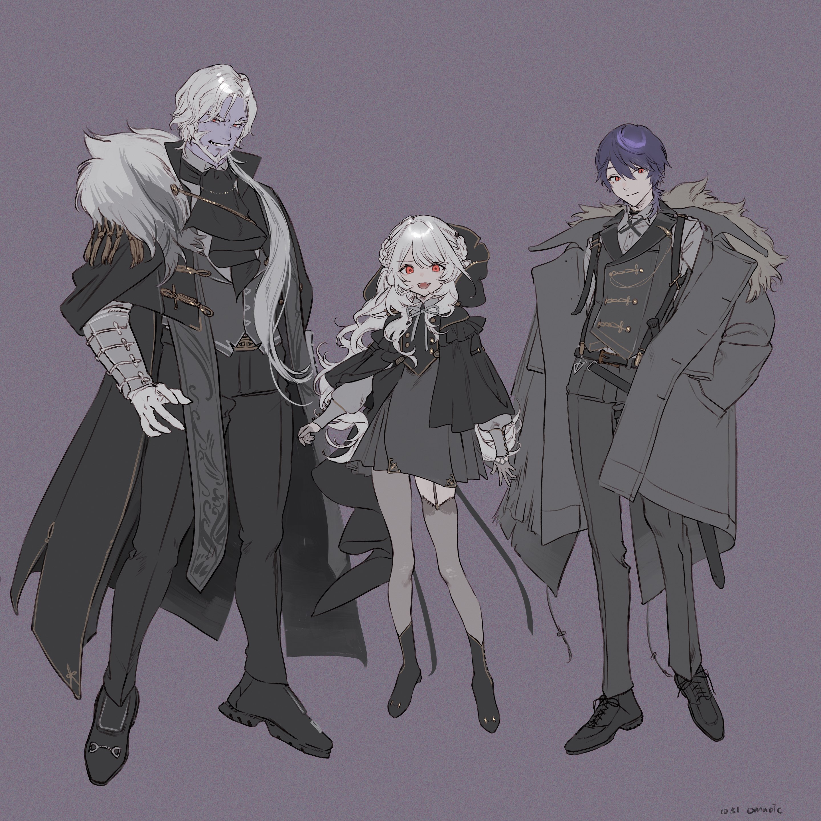 1girl 2boys absurdres alternate_hair_color ascot beard belt black_ascot black_belt black_cape black_capelet black_dress black_footwear black_pants black_pantyhose black_shirt black_thighhighs black_vest blue_hair blue_skin buttons cape capelet colored_skin commentary_request cross_tie double-breasted dress facial_hair full_body fur_trim garter_straps gilzaren_iii grey_background highres hood hood_up hooded_capelet kenmochi_touya long_hair long_sleeves looking_at_viewer morinaka_kazaki multiple_boys muted_color neck_ribbon nijisanji orexxxo pants pantyhose puffy_long_sleeves puffy_sleeves red_eyes ribbon shirt shoes simple_background single_leg_pantyhose single_thighhigh smile thighhighs vest virtual_youtuber vocaloid white_hair white_ribbon white_shirt wolfism_(vocaloid)