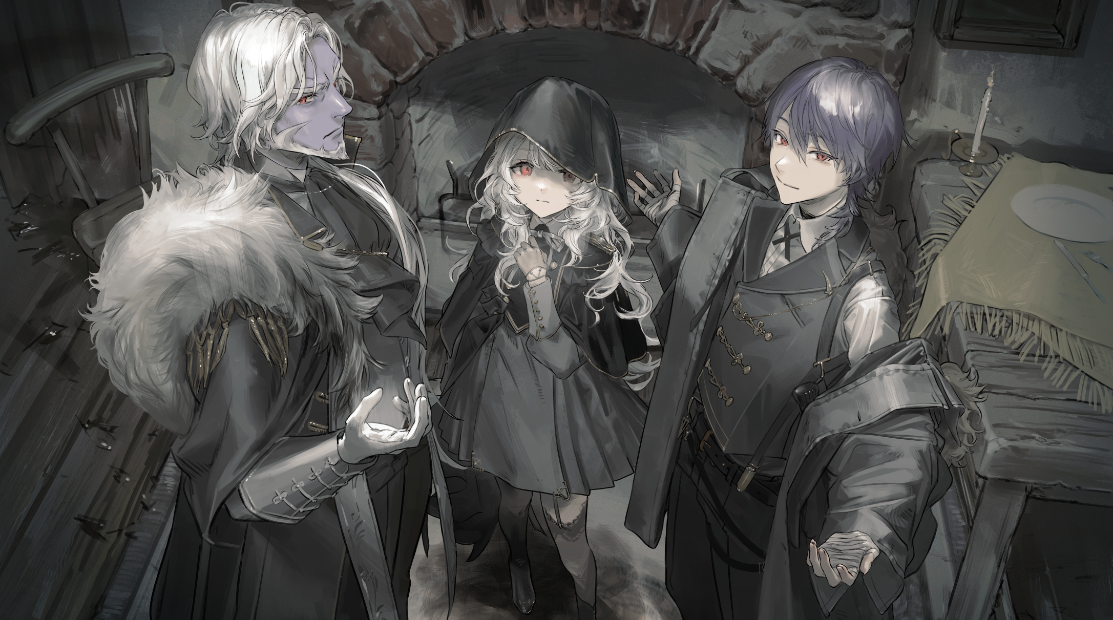 1girl 2boys alternate_hair_color beard belt black_belt black_cape black_capelet black_dress black_pants black_pantyhose black_shirt black_thighhighs black_vest blue_hair blue_skin buttons candle cape capelet colored_skin commentary_request cross_tie double-breasted drawer dress facial_hair fireplace from_above fur_trim garter_straps gilzaren_iii highres hood hood_up hooded_capelet indoors kenmochi_touya long_hair long_sleeves looking_at_viewer morinaka_kazaki multiple_boys muted_color neck_ribbon nijisanji orexxxo pants pantyhose puffy_long_sleeves puffy_sleeves red_eyes ribbon shirt single_leg_pantyhose single_thighhigh smile table tablecloth thighhighs vest virtual_youtuber vocaloid white_hair white_ribbon white_shirt wolfism_(vocaloid)