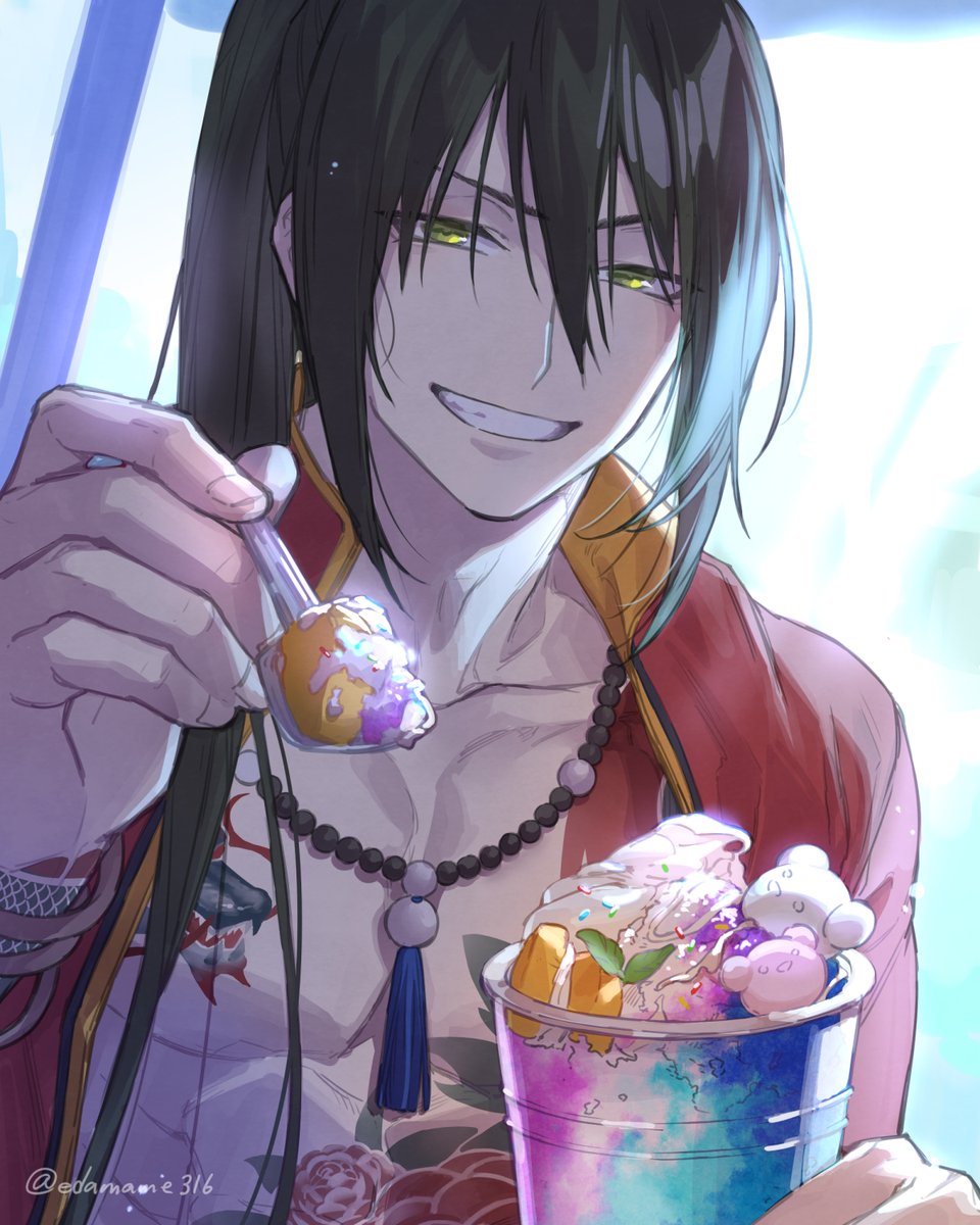 1boy alternate_hairstyle black_hair chain chain_necklace commentary_request dragon_tattoo edamameoishii fate/grand_order fate_(series) flower_tattoo food full-body_tattoo green_eyes hair_between_eyes highres holding holding_food holding_ice_cream holding_spoon ice_cream jacket jewelry long_hair long_sleeves looking_at_viewer male_focus necklace official_alternate_costume pearl_necklace ponytail red_jacket smile solo spoon tattoo teeth toned toned_male twitter_username upper_body very_long_hair yan_qing_(fate) yan_qing_(training_wear)_(fate)