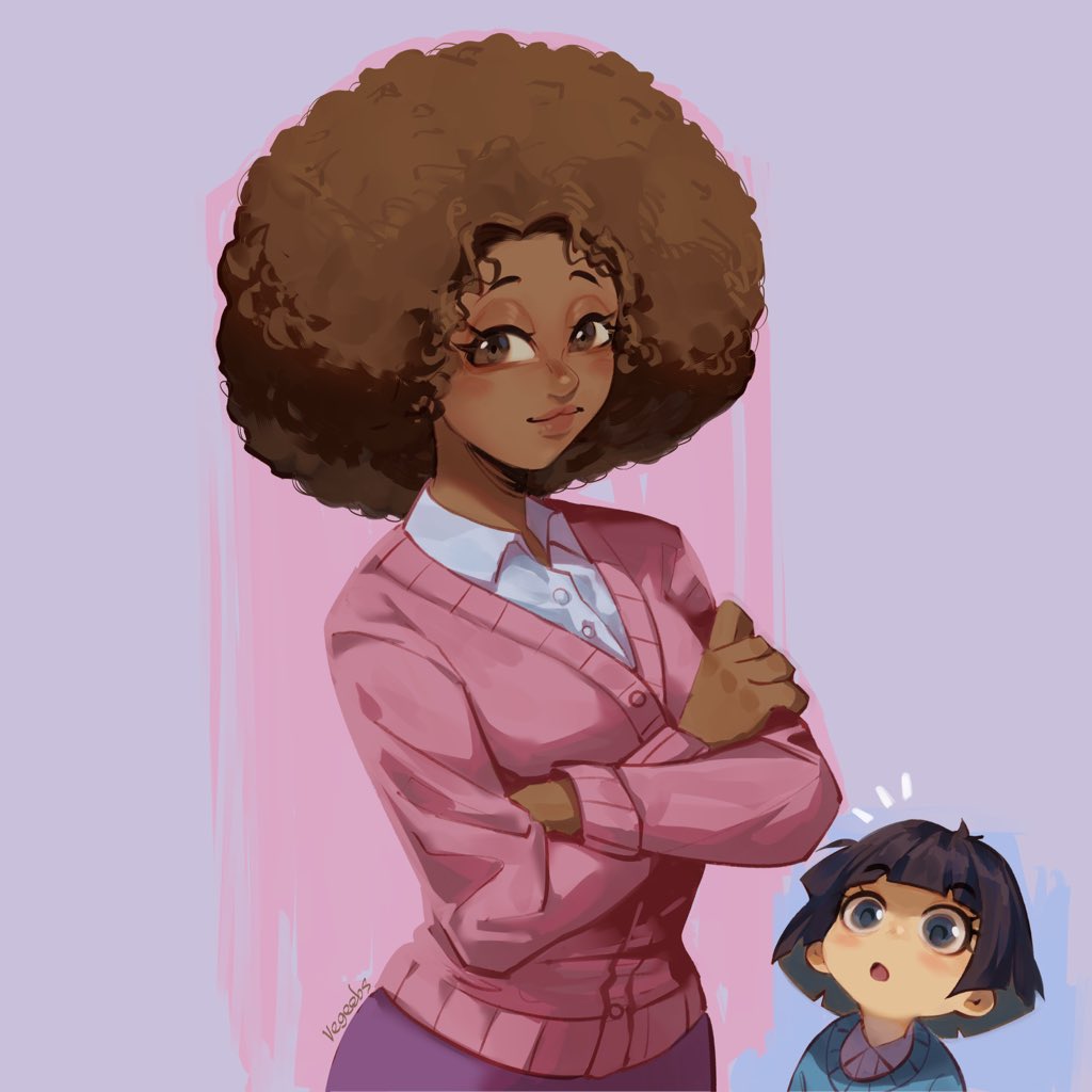 2girls afro age_difference artist_name big_hair black_hair blush breasts brown_hair child crossed_arms dark_skin dragon_ball dragon_ball_super dragon_ball_super_super_hero earrings janet_(dragon_ball) jewelry kindergarten_uniform lips looking_at_another looking_at_viewer medium_breasts multiple_girls pan_(dragon_ball) shiny_skin short_hair simple_background smile standing teacher vegeebs wide_hips