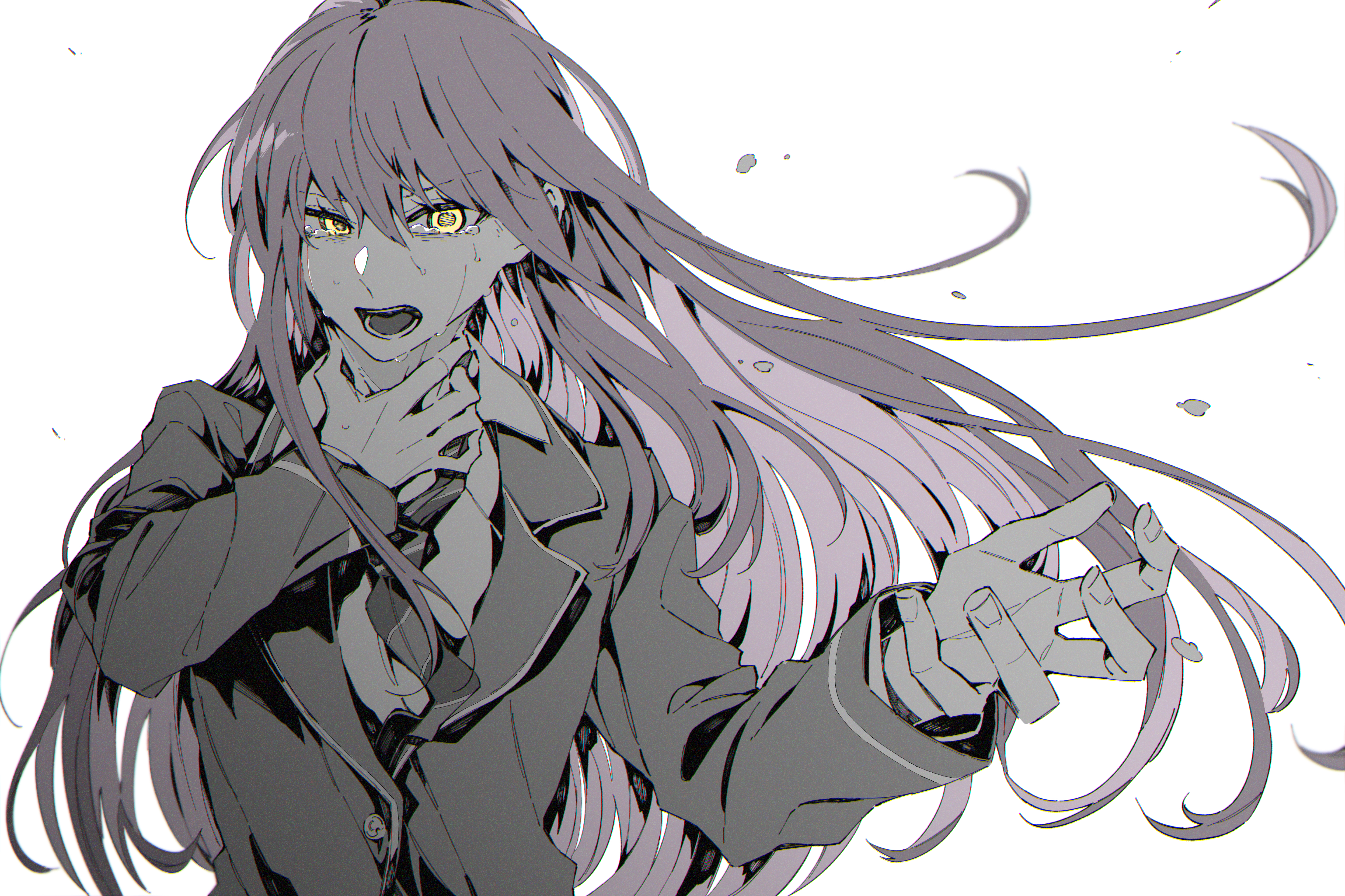 1girl absurdres ayutarochan bang_dream! bang_dream!_girls_band_party! blazer grey_hair grey_jacket haneoka_school_uniform highres jacket light_purple_hair long_hair long_sleeves minato_yukina necktie open_mouth school_uniform solo striped_clothes striped_necktie tears yellow_eyes