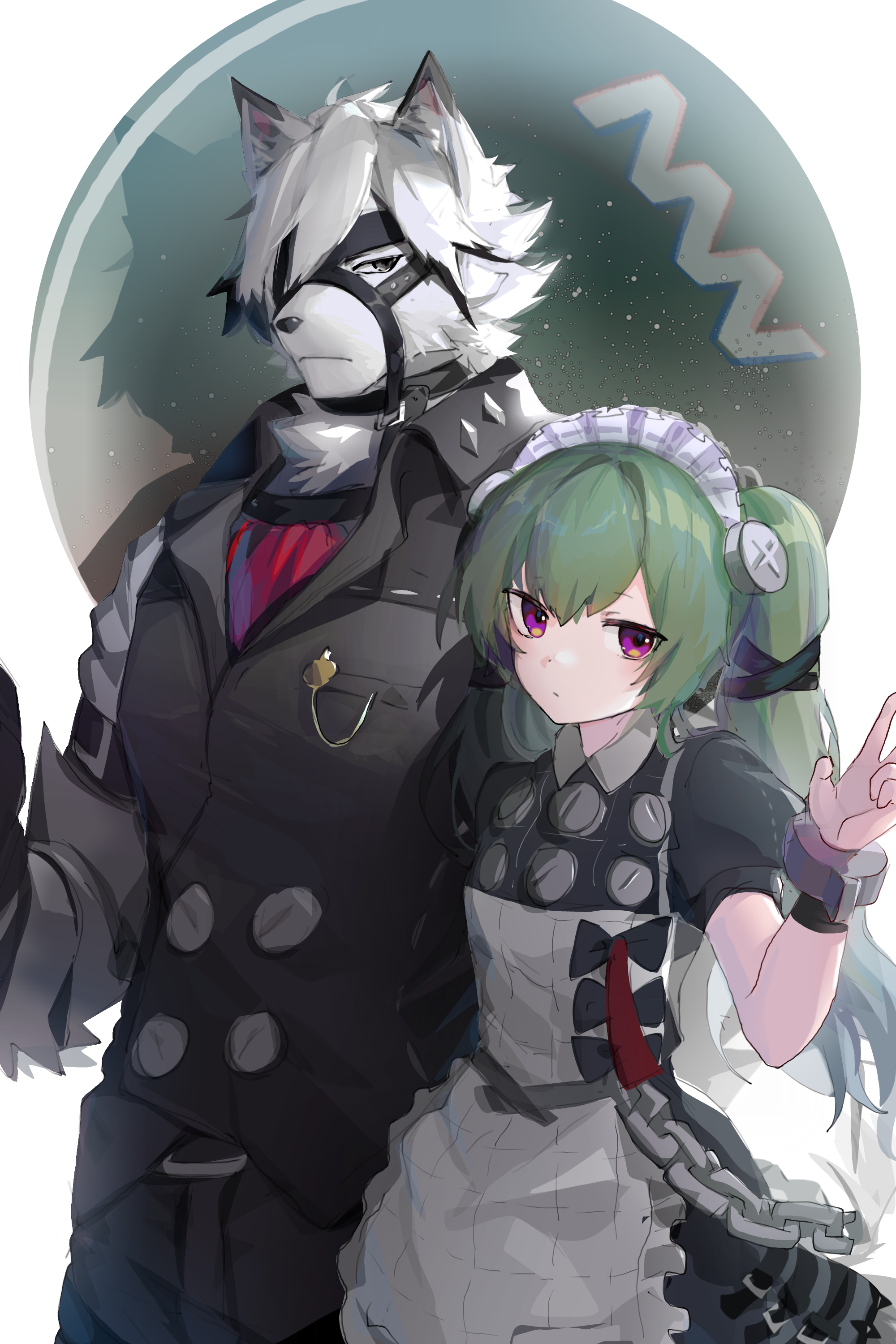 1boy 1girl absurdres animal_ears apron chain corin_wickes cowboy_shot furry furry_male green_hair grey_eyes highres looking_to_the_side maid_apron maid_headdress purple_eyes shabi96522 twintails unamused von_lycaon white_fur white_hair wolf_boy wolf_ears zenless_zone_zero