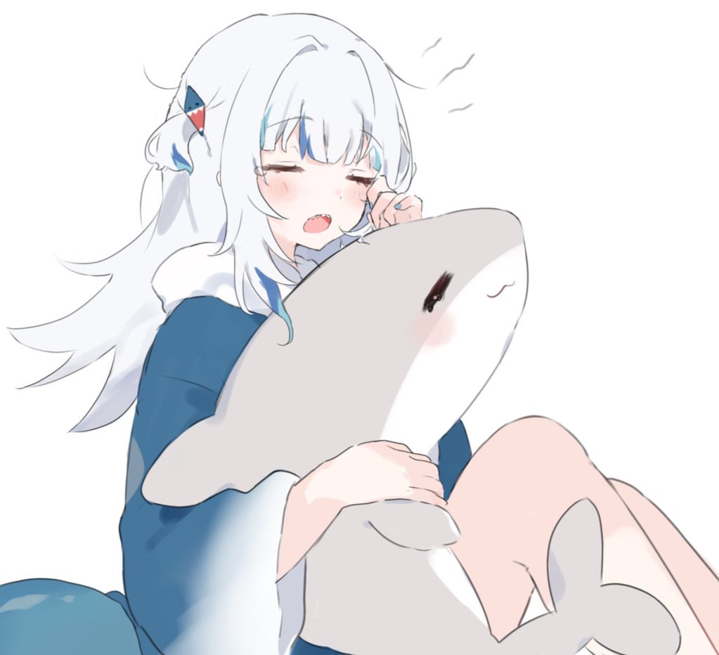 1girl bad_id bad_pixiv_id blue_hair blue_hoodie blunt_bangs bunchi closed_eyes colored_inner_hair gawr_gura hair_ornament holding holding_stuffed_toy hololive hololive_english hood hood_down hoodie knees_up long_hair multicolored_hair one_side_up open_mouth shark_hair_ornament sharp_teeth sidelocks simple_background sitting solo stuffed_animal stuffed_shark stuffed_toy teeth two-tone_hair upper_teeth_only virtual_youtuber waking_up white_background white_hair