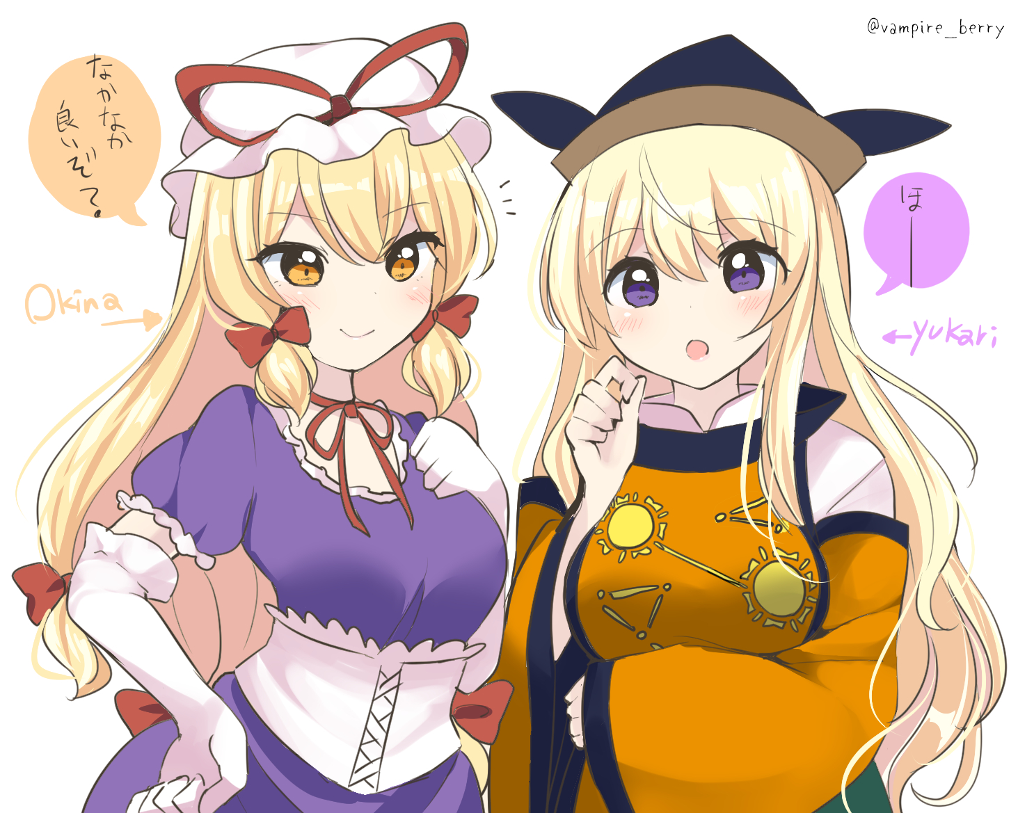2girls black_headwear blonde_hair blush closed_mouth constellation_print cosplay costume_switch dress elbow_gloves gloves hair_between_eyes hat hat_ribbon long_hair matara_okina matara_okina_(cosplay) mob_cap multiple_girls open_mouth orange_sleeves ougi_hina purple_dress purple_eyes red_ribbon ribbon short_sleeves simple_background smile speech_bubble tabard touhou translation_request twitter_username upper_body white_background white_gloves white_headwear wide_sleeves yakumo_yukari yakumo_yukari_(cosplay) yellow_eyes